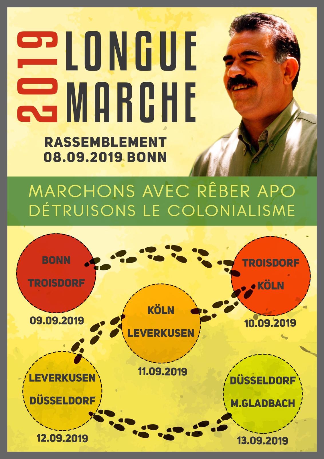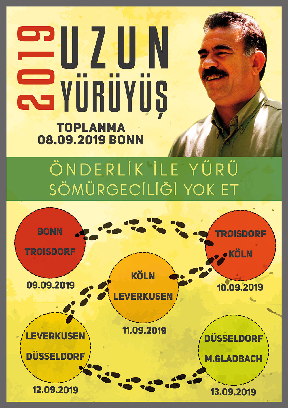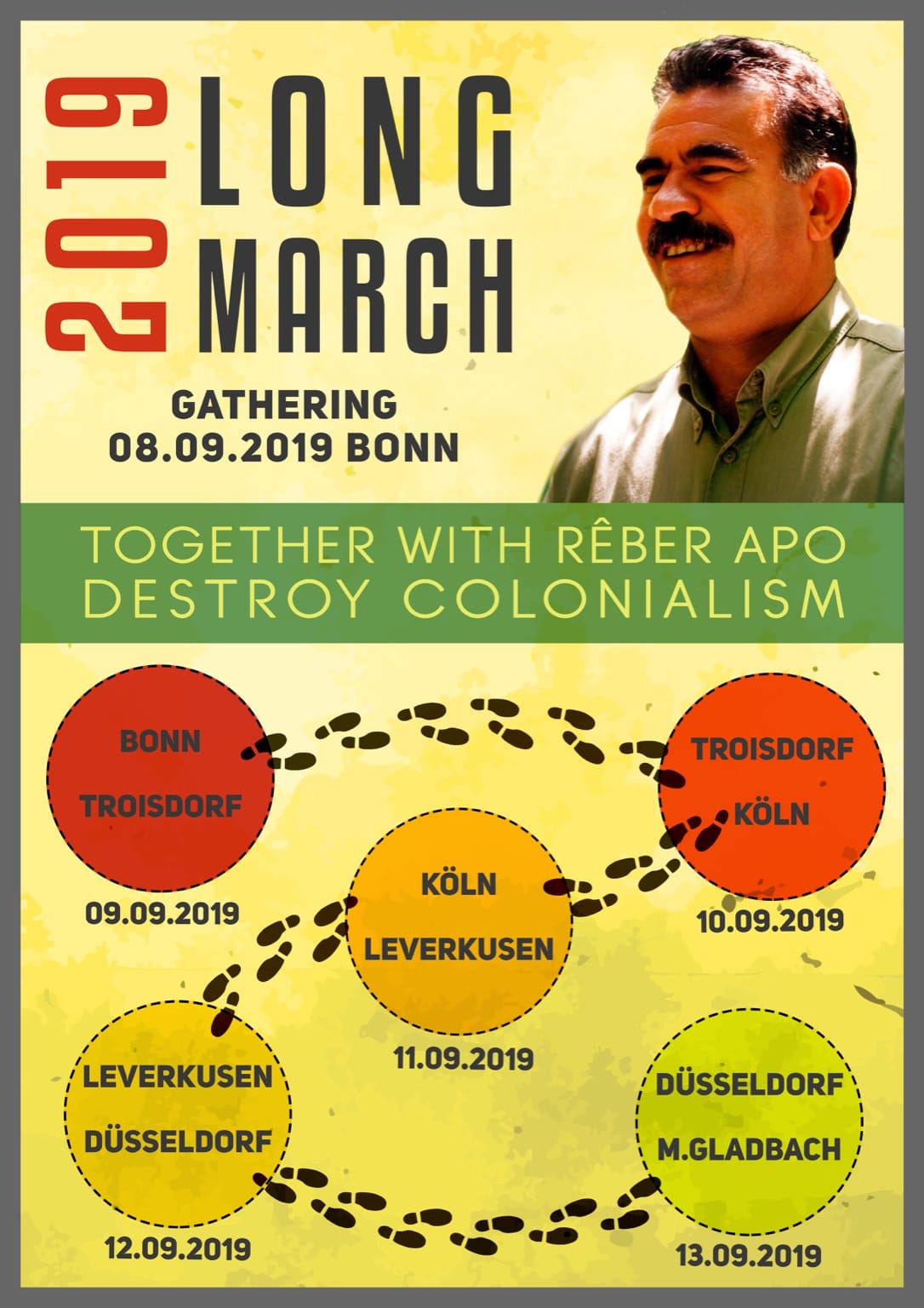 Halklar Önderi Abdullah Öcalan'ın özgürlüğü talebiyle düzenlenen Uzun Yürüyüş eylemi Almanya'nın Bonn şehrinde 8 Eylül günü başlıyor. Eylemin şiarı "Önderlik ile Yürü, Sömürgeciliği Yok Et" olarak belirlendi.