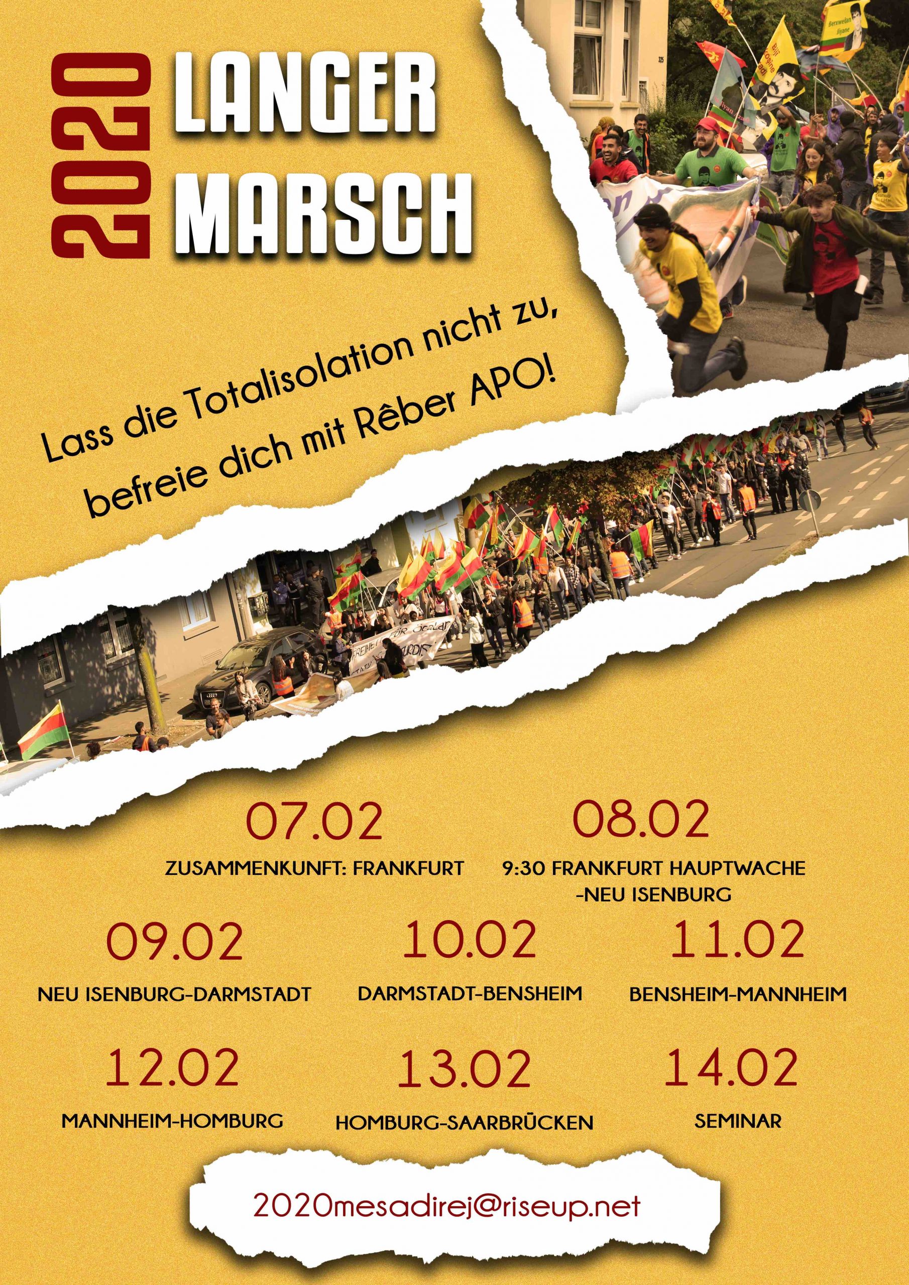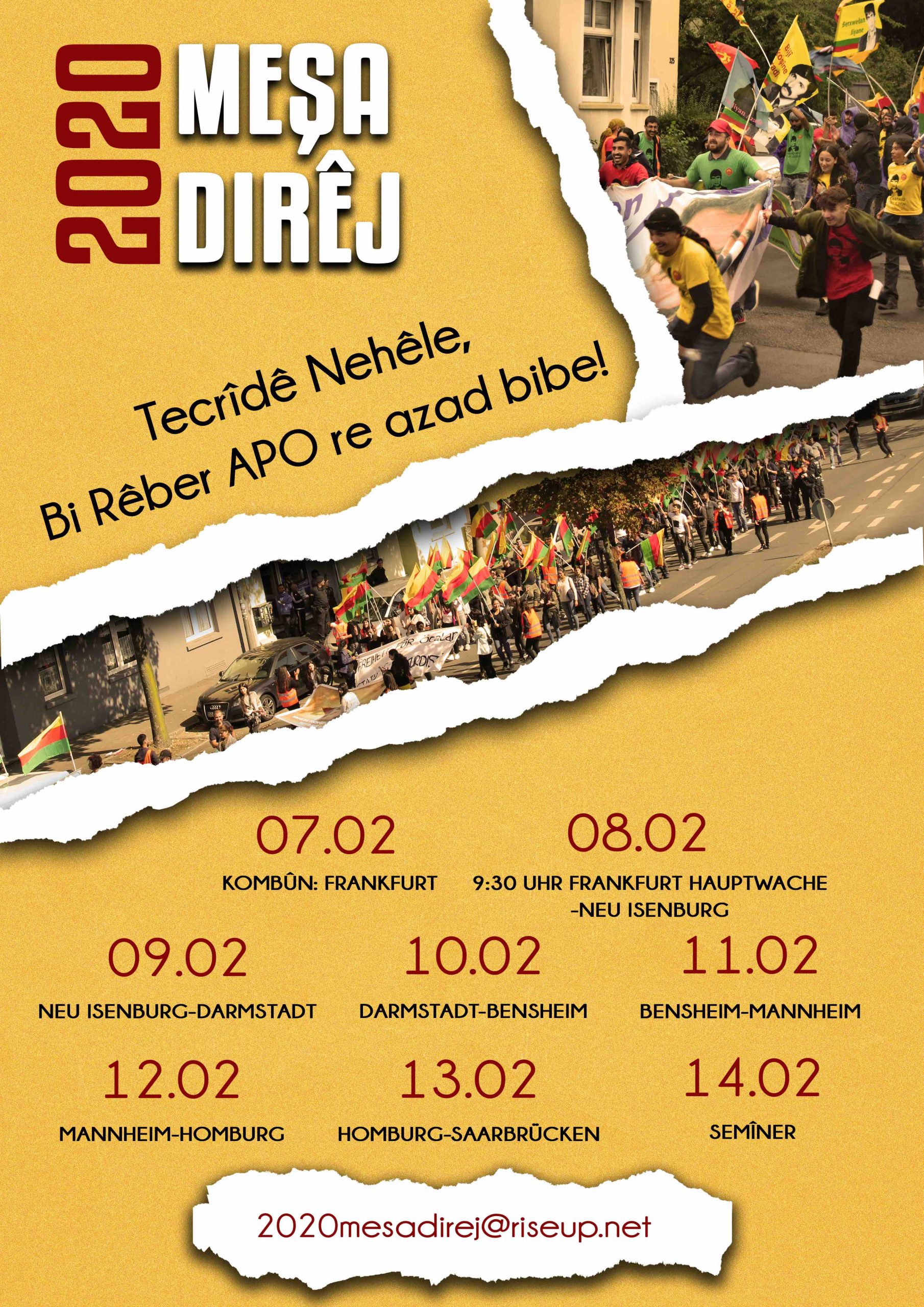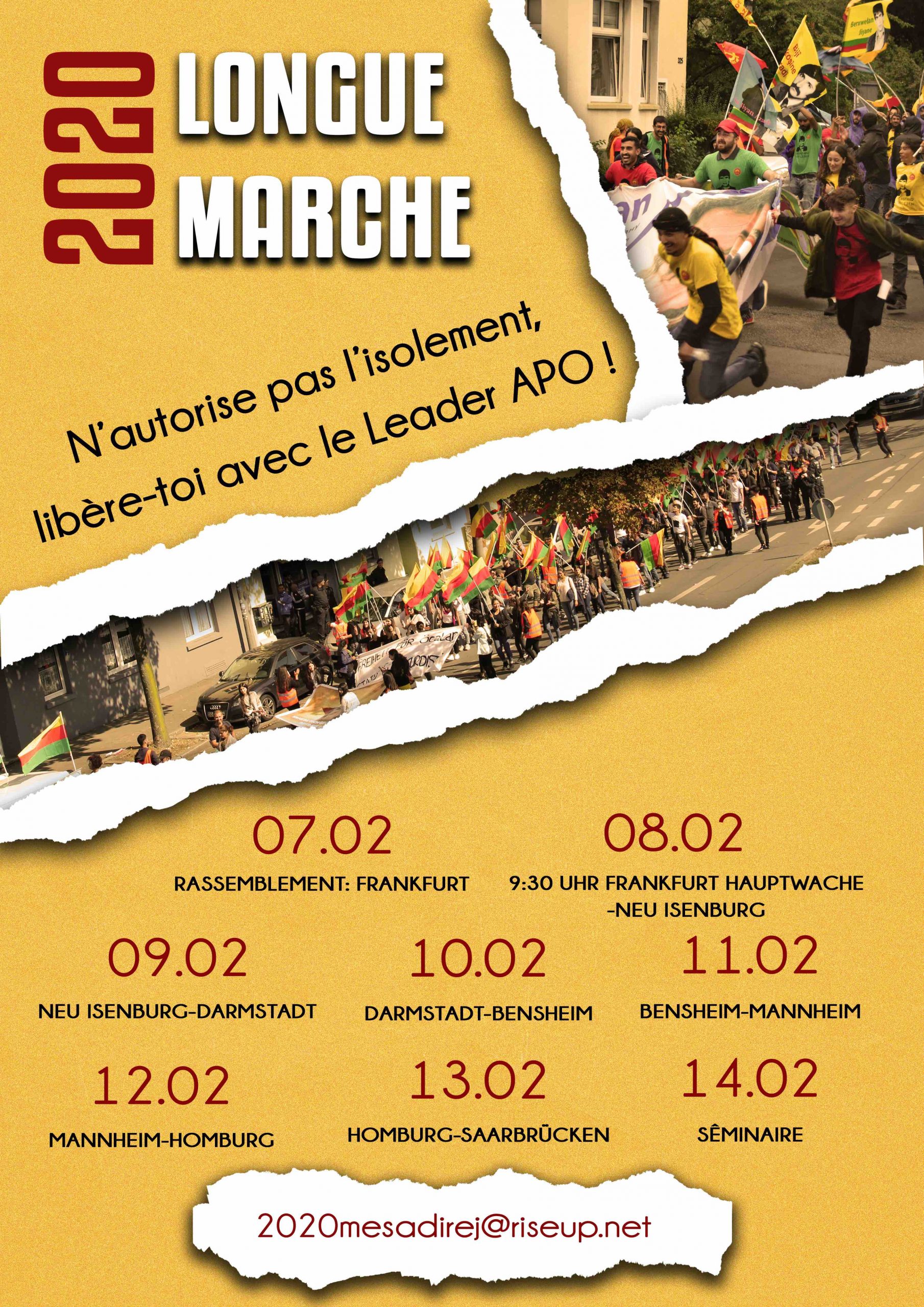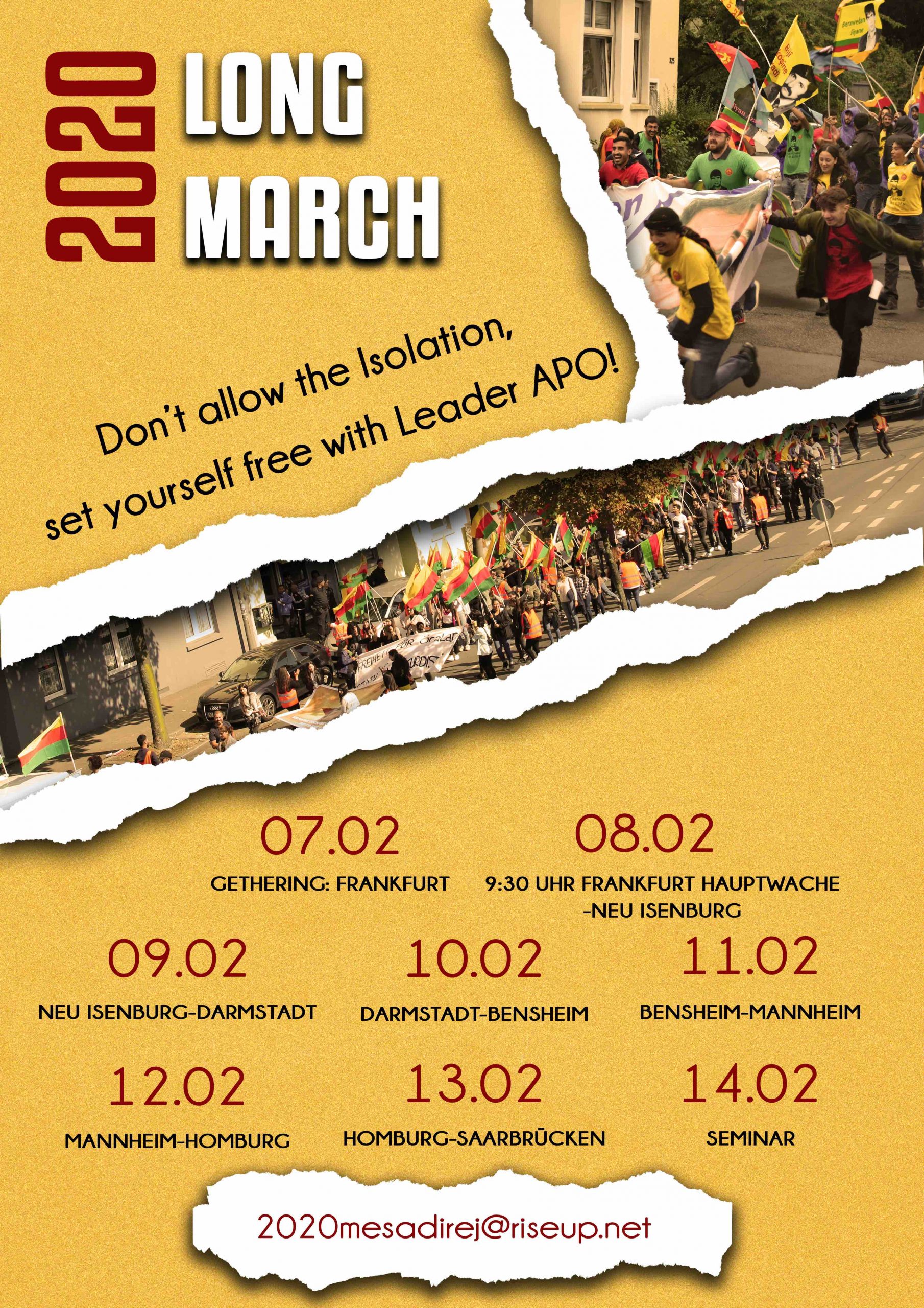 8 Şubat’ta Almanya Frankfurt’tan “Tecride izin verme, Rêber APO ile Özgürleş” şiarıyla başlayacak Uzun Yürüyüş öncesi tertip komitesi bir açıklama yayınladı. Komite, aynı zamanda 6 Şubat Perşembe günü Avrupa saati ile 19.00’dan itibaren “#MeşaDirej2020” şeklinde bir sosyal medya çalışması da yapacaklarını duyurdu.