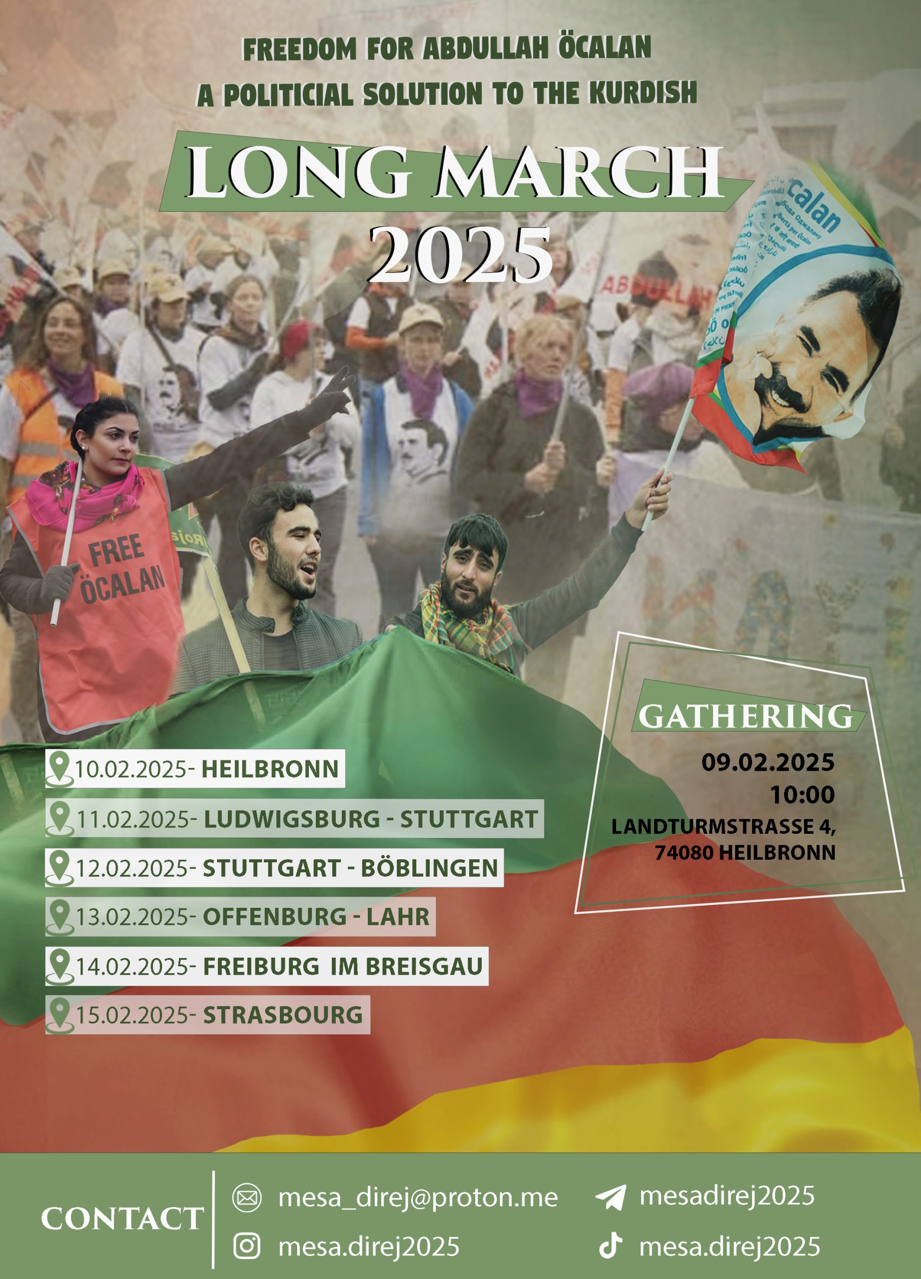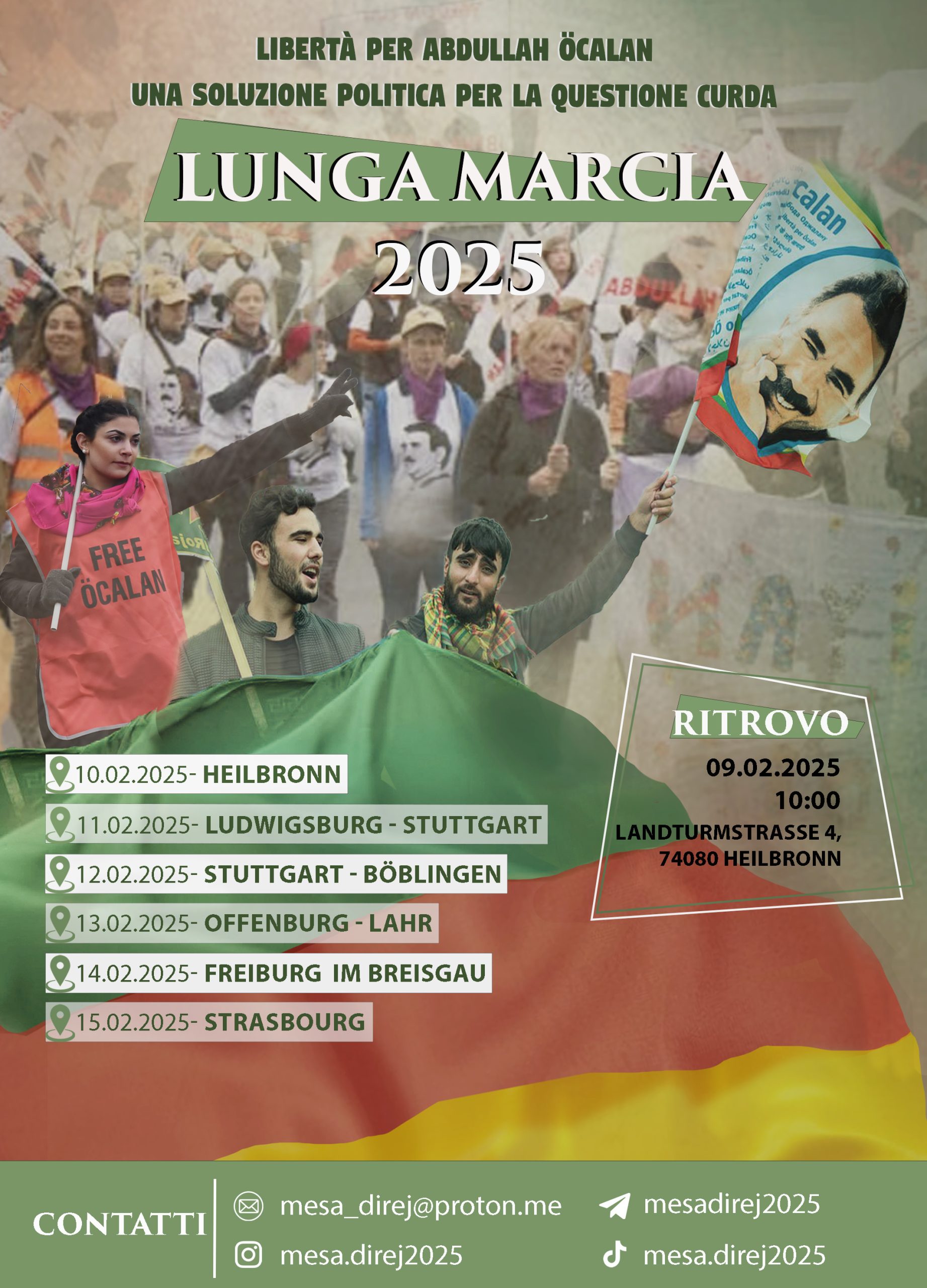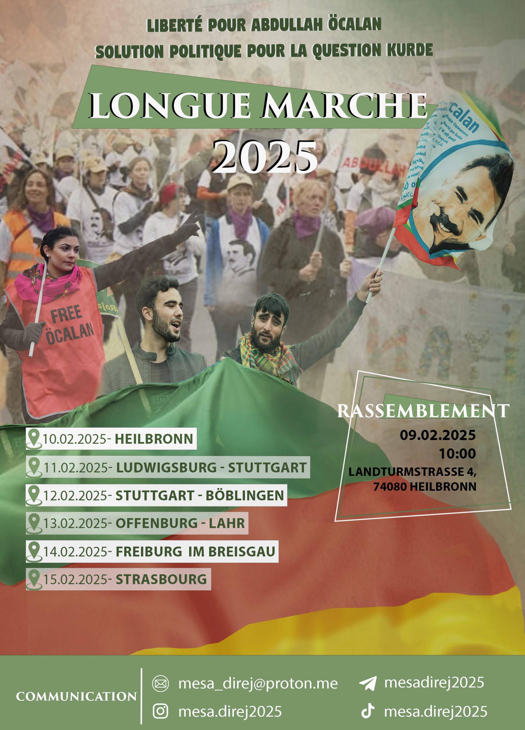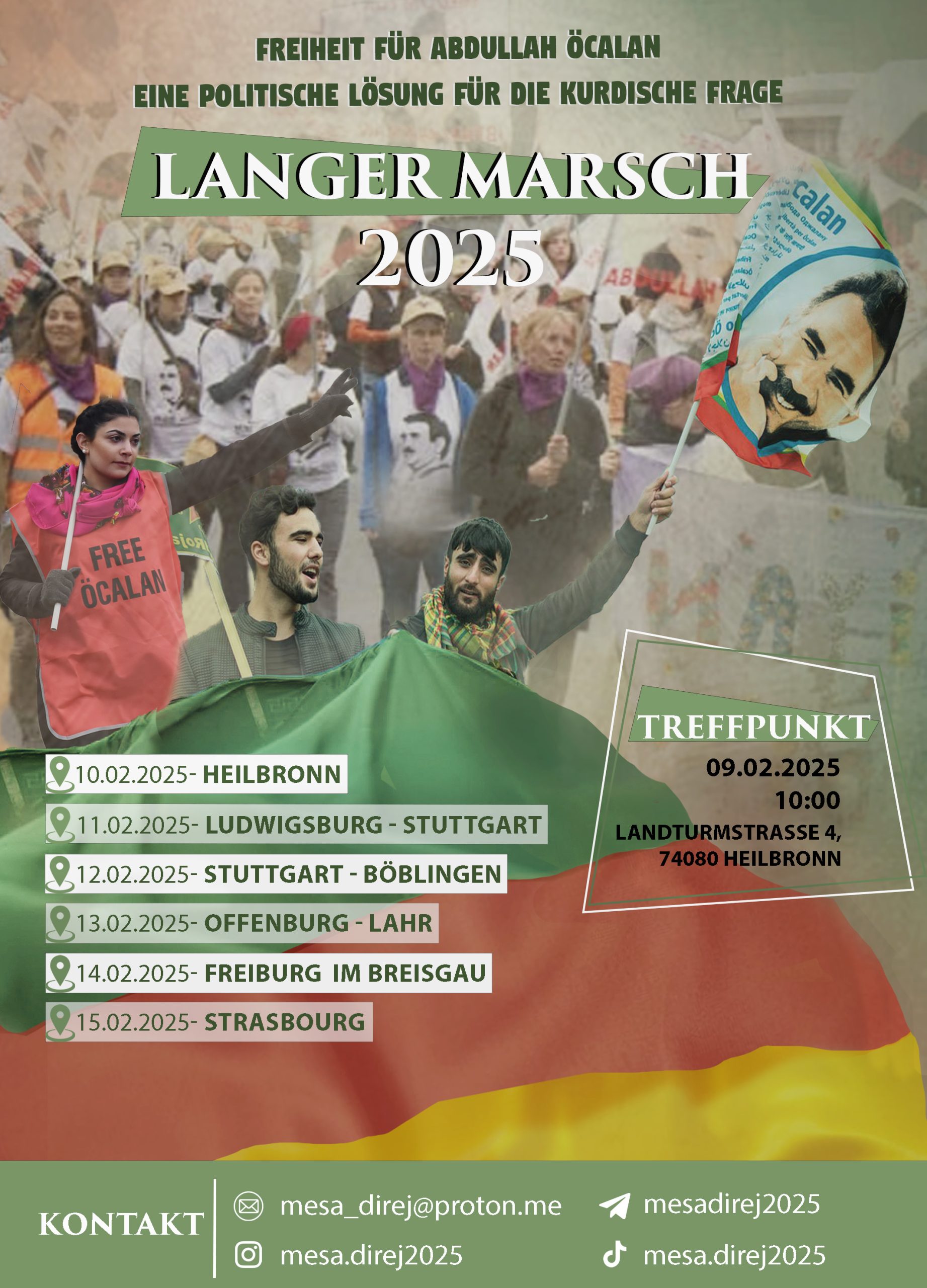 “Önder Apo’ya Özgürlük, Kürt Sorununa Çözüm hamlesi kapsamında, 10 Şubat’ta Almanya’nın Heilbronn kentinde başlayacak olan Uzun Yürüyüş’e saatler kaldı. Avrupa’nın dört bir yanından gelecek olan Kürdistanlı ve enternasyonalist gençler, yarın Heilbronn’da toplanacak.