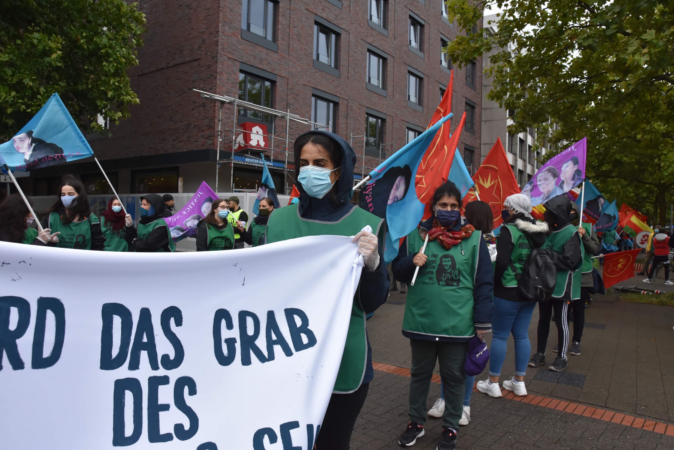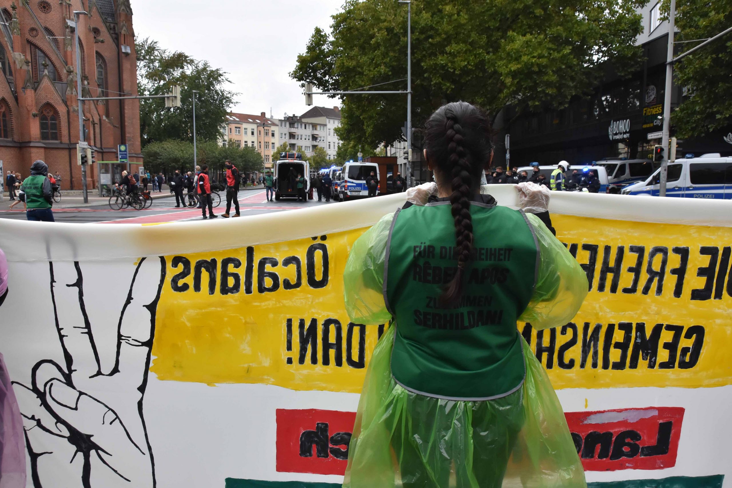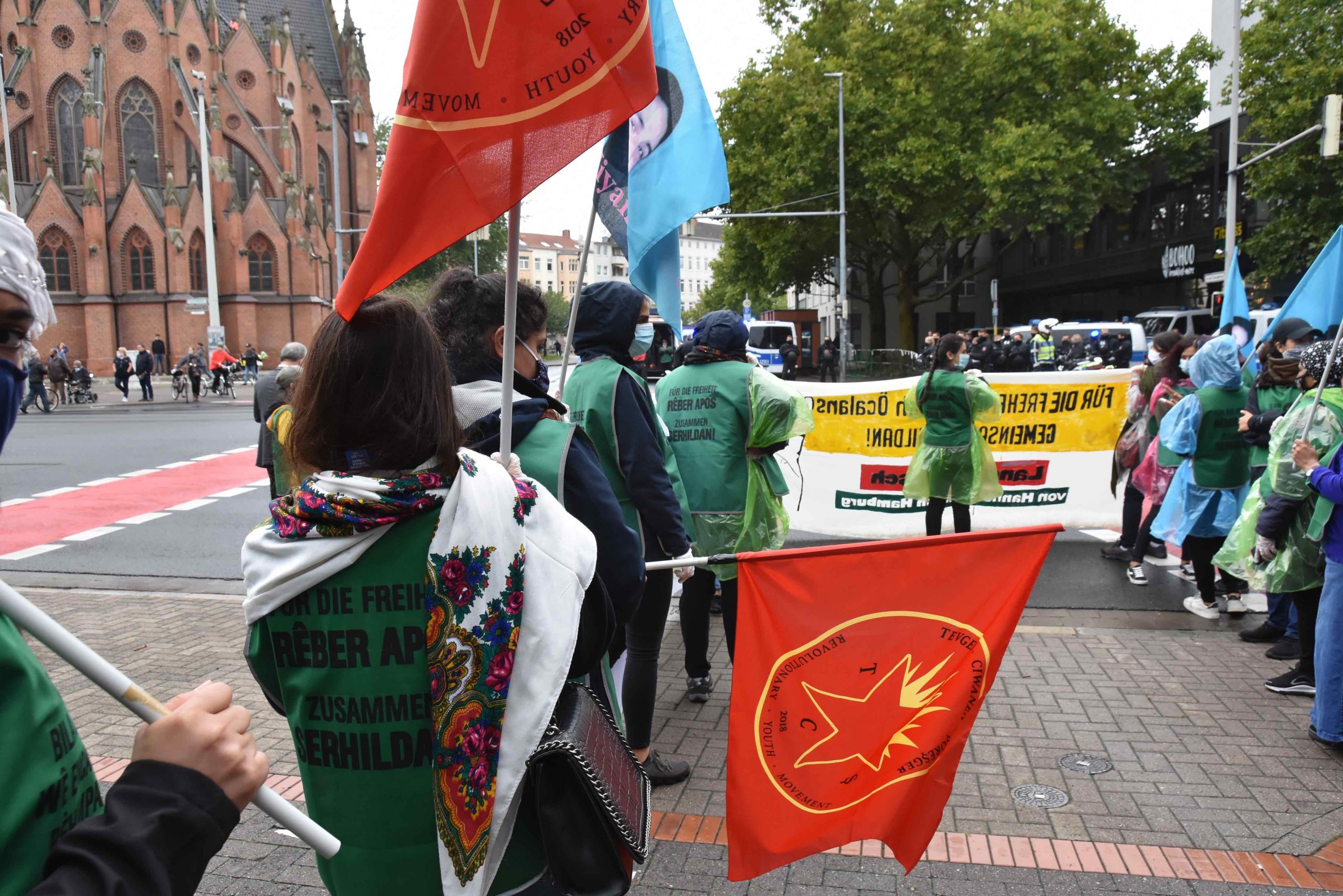 Genç kadınların öncülüğünde başlayan eylemde, Alman polisi henüz yürüyüş başlamadan bir dizi yasak getirerek gençlerin yürüyüşünü provoke etmek istedi. Halklar Önderi Abdullah Öcalan’a ve Kürt Özgürlük Hareketi’ni yansıtan her slogan ve bayrağı yasaklayan polise karşı gençler eylemlerine çok daha kararlı ve coşkulu bir şekilde devam ediyorlar.