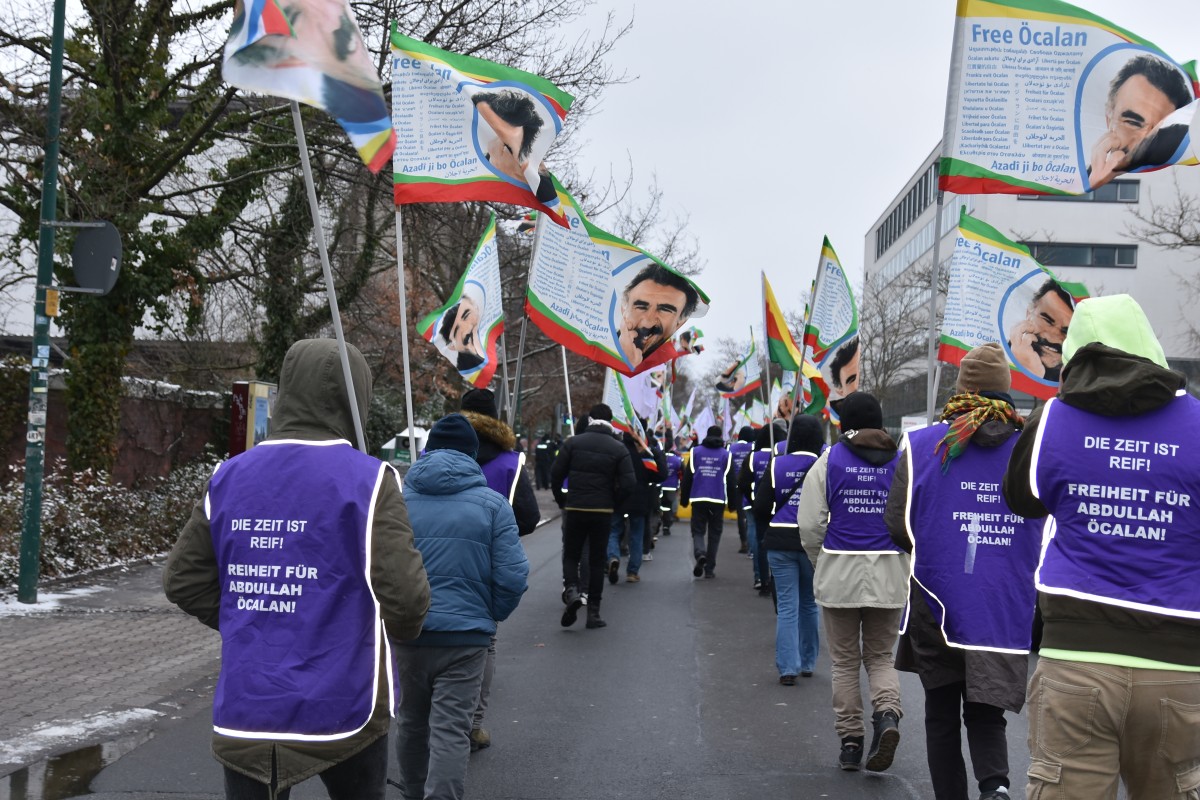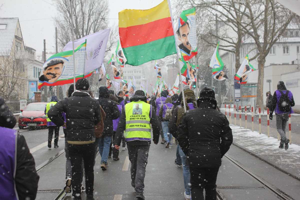 Büyük bir coşkuyla süren yürüyüş, çevredeki insanların da ilgisini çekerken, yürüyüş boyunca Almanca ve Kürtçe, “Es lebe Öcalan”, “Bijî Serok APO”, “Bijî Berxwedana Zindana”, “Hoch die Internationale Solidarität”, “Bi Hev Re Serhildan”, “Weg mit dem Verbot der PKK” sloganları atıldı.