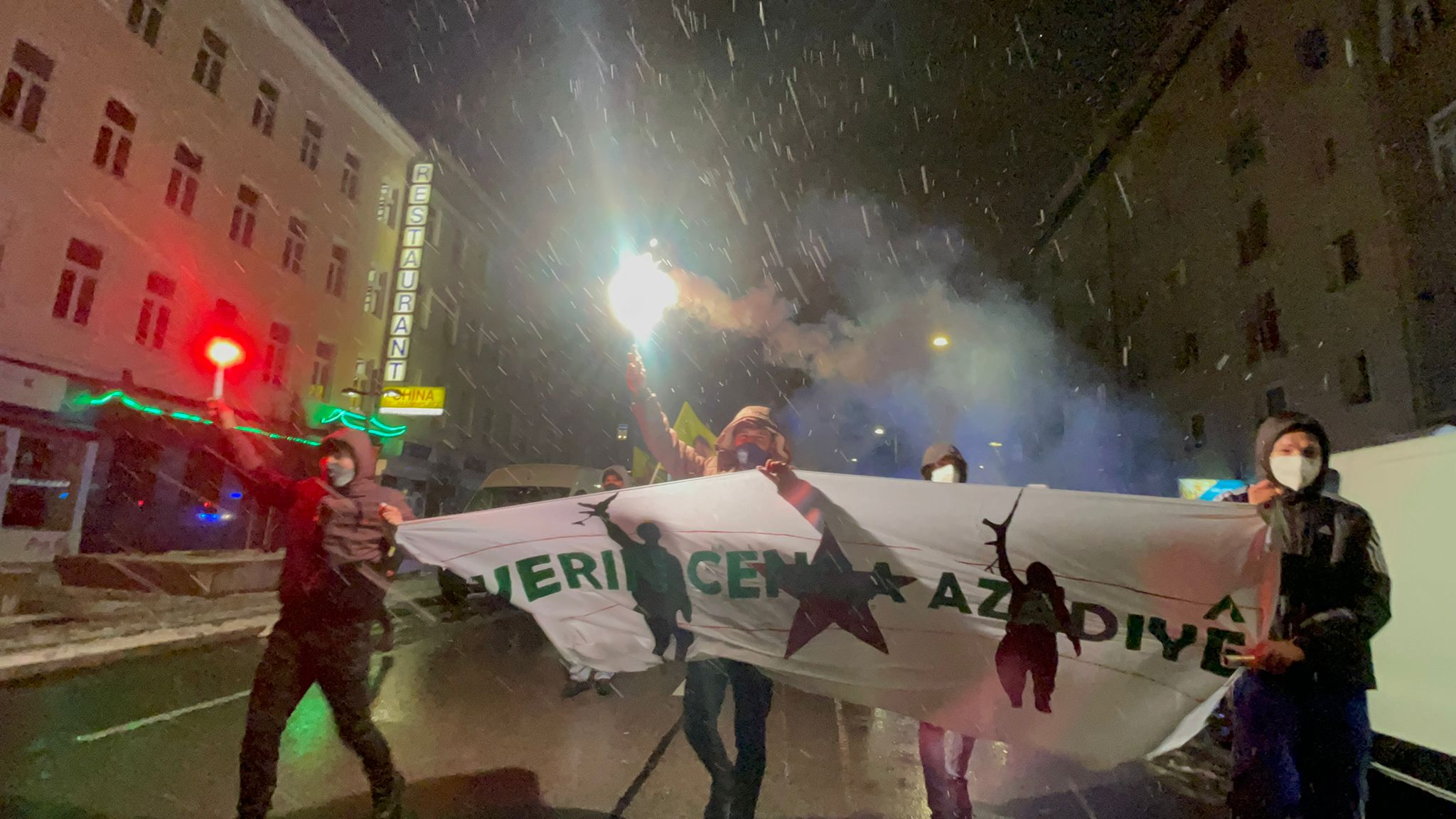 Faşistlerin yoğunluklu olarak yaşadığı Reumanplatz’da gençler tarafından Önder Öcalan bayrakları ve “Werin Cenga Azadiyê” yazılı pankart taşındı. Provokasyonlar ile karşı karşıya kalan gençler sık sık “Bijî Serok APO” , “Bijî PKK” ve “Bijî Berxwedana Gerîla” sloganları attı.
