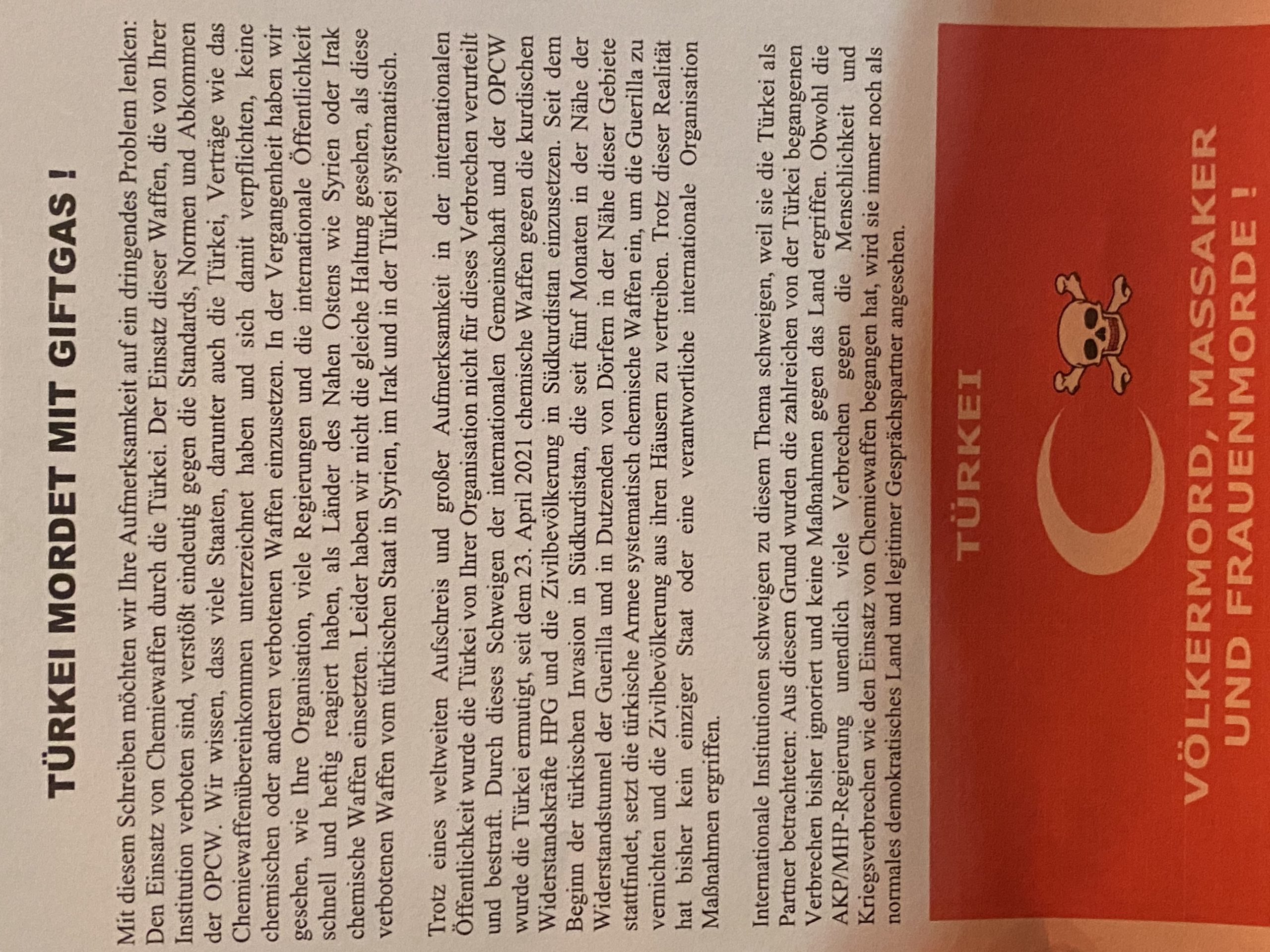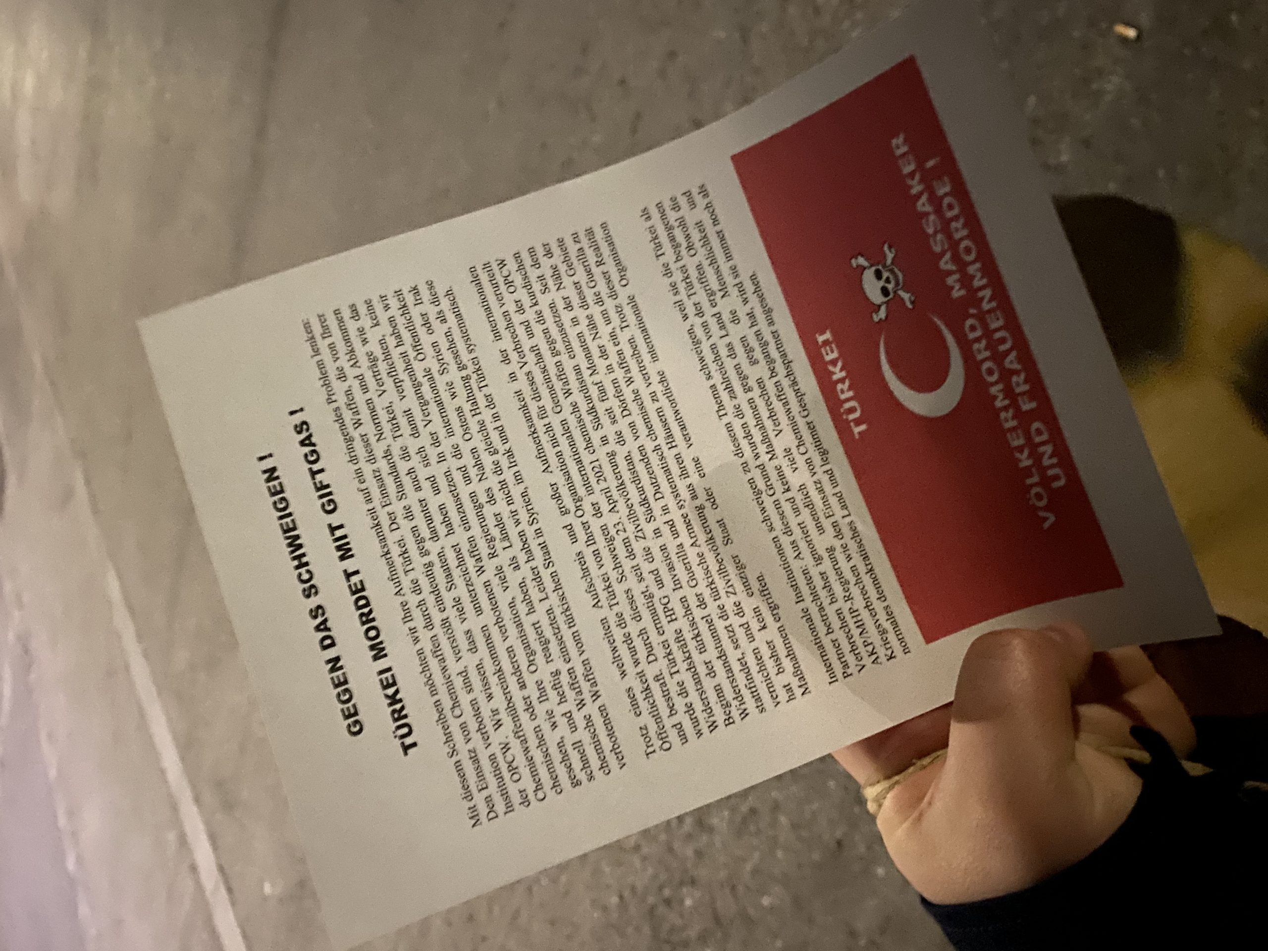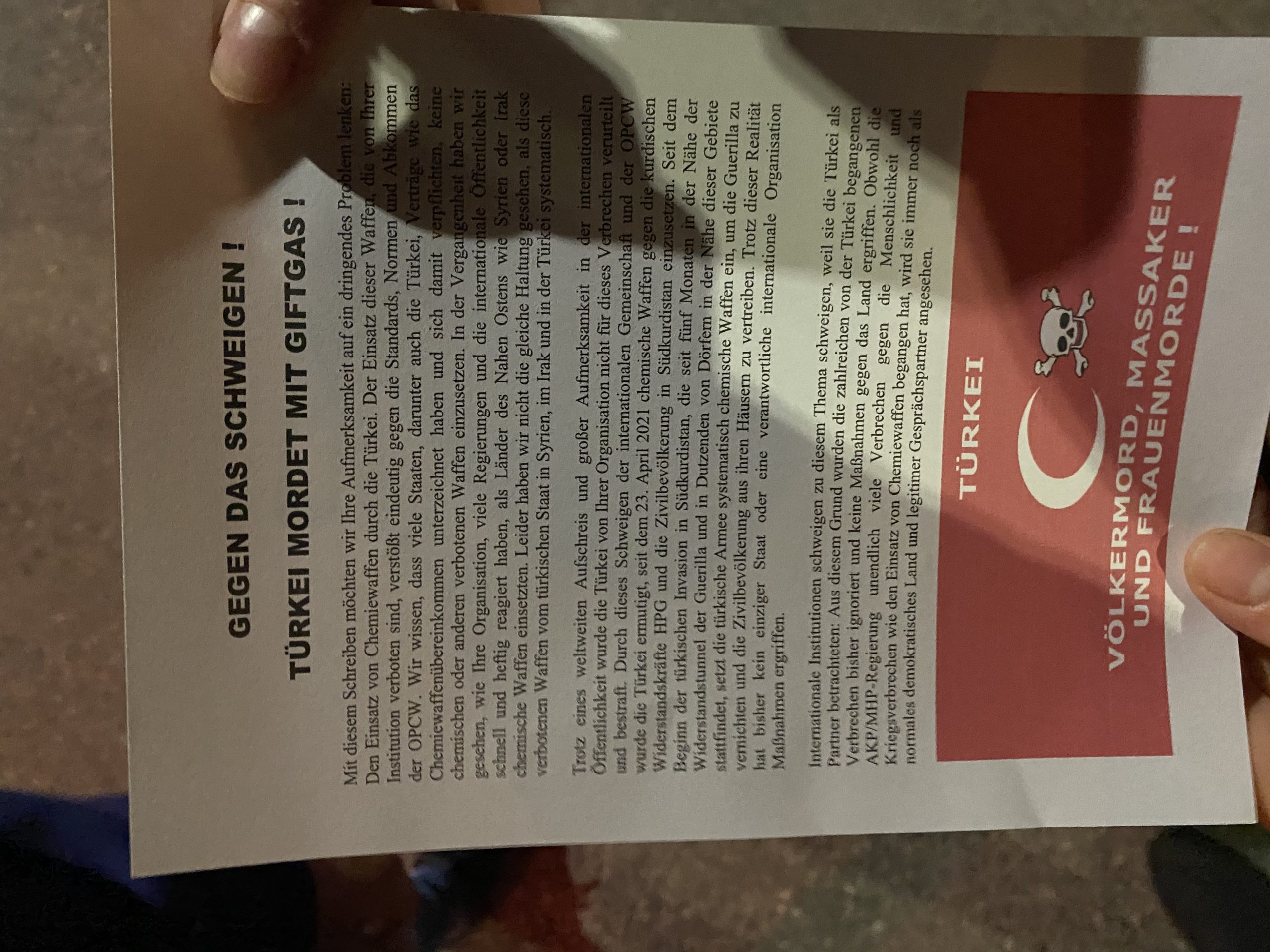 Gençler yaptıkları eylemde Kürdistan’da faşist TC zihniyetini savaş suçları işlediğini ve her türlü desteği sunan NATO ülkelerinin de bu suça ortak olduklarını vurguladılar. Son dönemde faşist TC zihniyetinin Kürdistan’da Kahramanca savaşan Gerillalara karşı savaş suçu olarak farklı boyutlarda kimyasal silah kulanımı artmaya başladı.Ve biz gençler olarak her zaman Kahramanca savaşan Gerillanın yanında olacağımızı ve Avrupa’da yaşayan tüm Kürdistan’lı halkımızı alanlara çağırıyoruz’’ dediler.