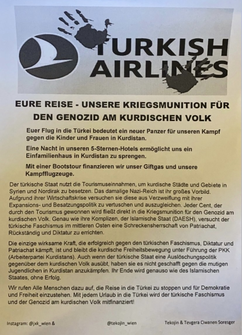 VİYANA – TCŞ ve TekoJIN aktivistleri Türk hava yollarının boykot edilmesine ilişkin bir pankartla merkezi trenlerde bir eylem gerçekleştirdiler. Trenlerde boykota ilişkin bir açıklama okuyan gençler bildiriler dağıttılar.