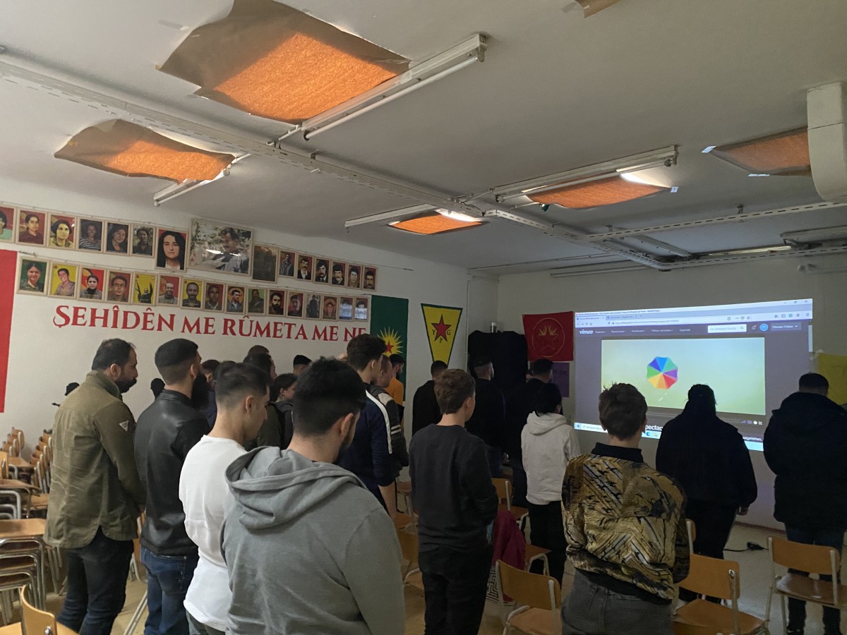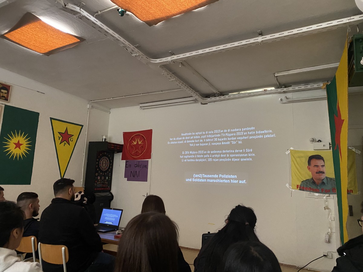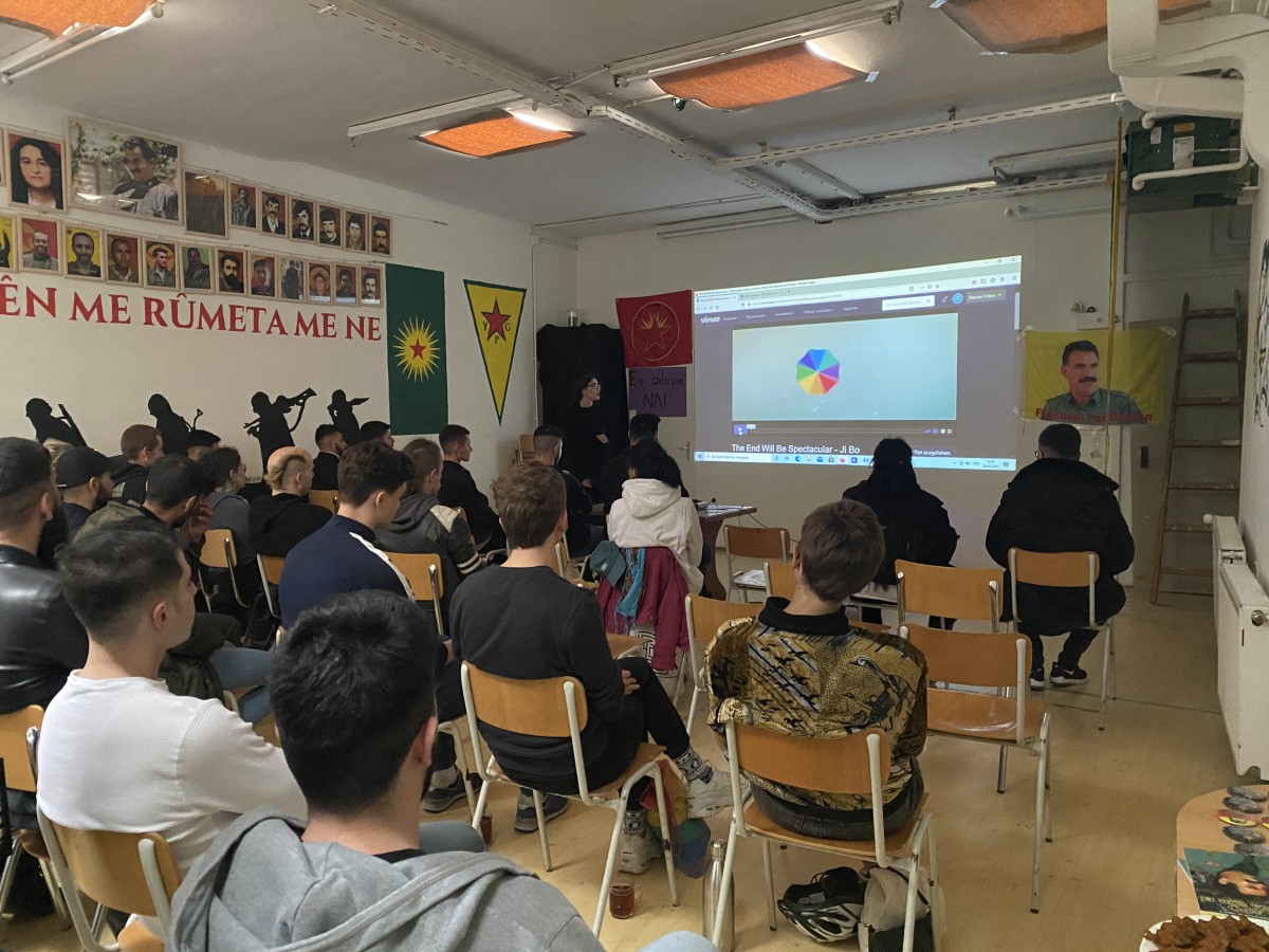 Film bittikten sonra siyasal süreci değerlendiren gençler, faşist Türk devletinin Kürdistan’daki soykırımcı işgal saldırıları ve gençliğin bu saldırılara karşı Avrupa’daki tavrının nasıl olması gerektiği konuları tartışıldı.