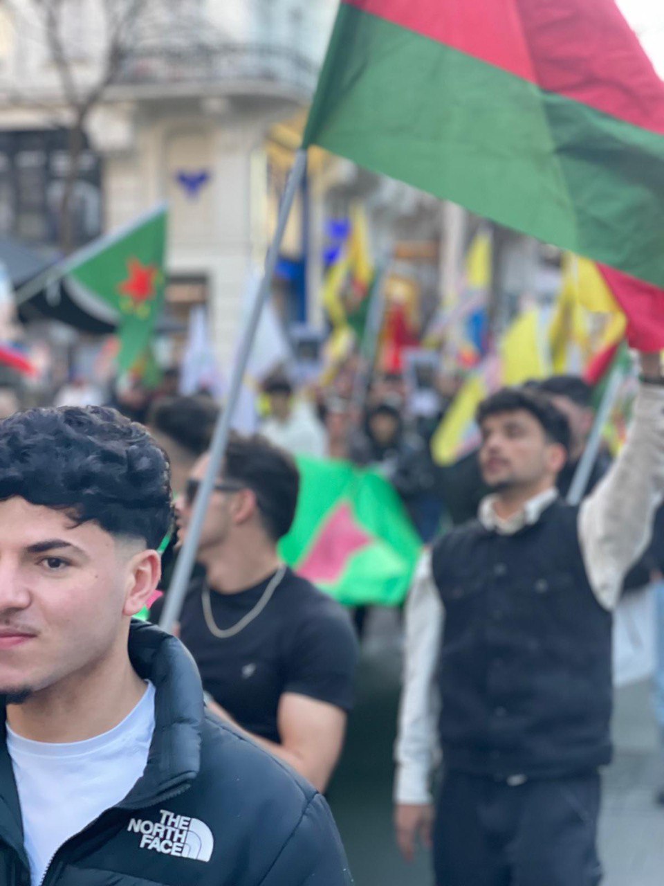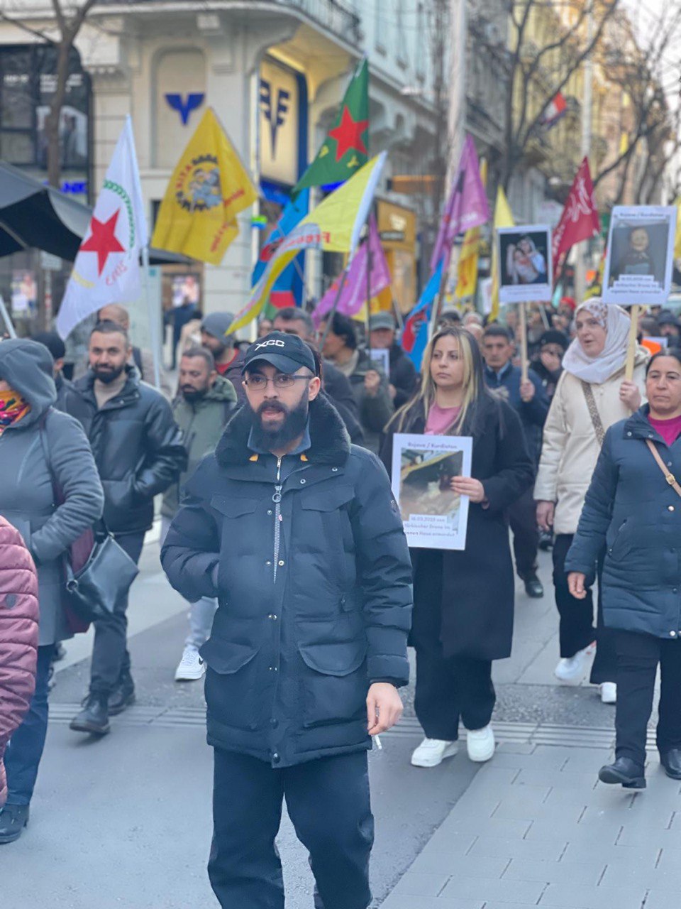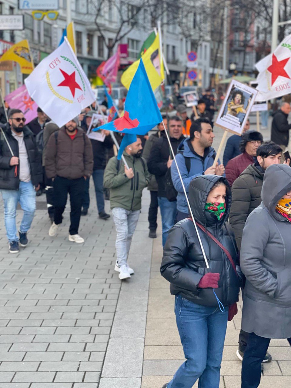 Eylemciler sık sık “Terörist Erdoğan”, “Şehîd Namirin”, “Bijî Serok APO”, “Bijî Berxwedana Kobanê” ve “Bijî Berxwedana Rojava” sloganları atarak Kürt halkının direnişini selamladı.
