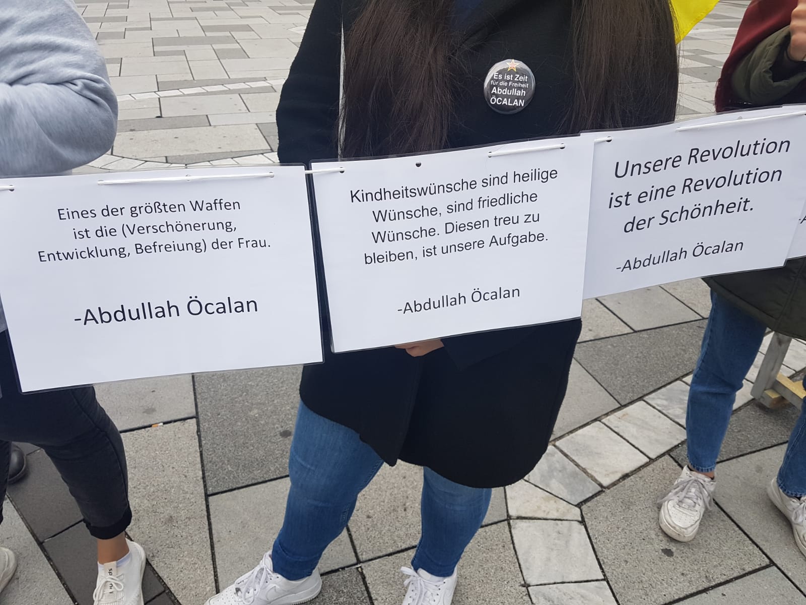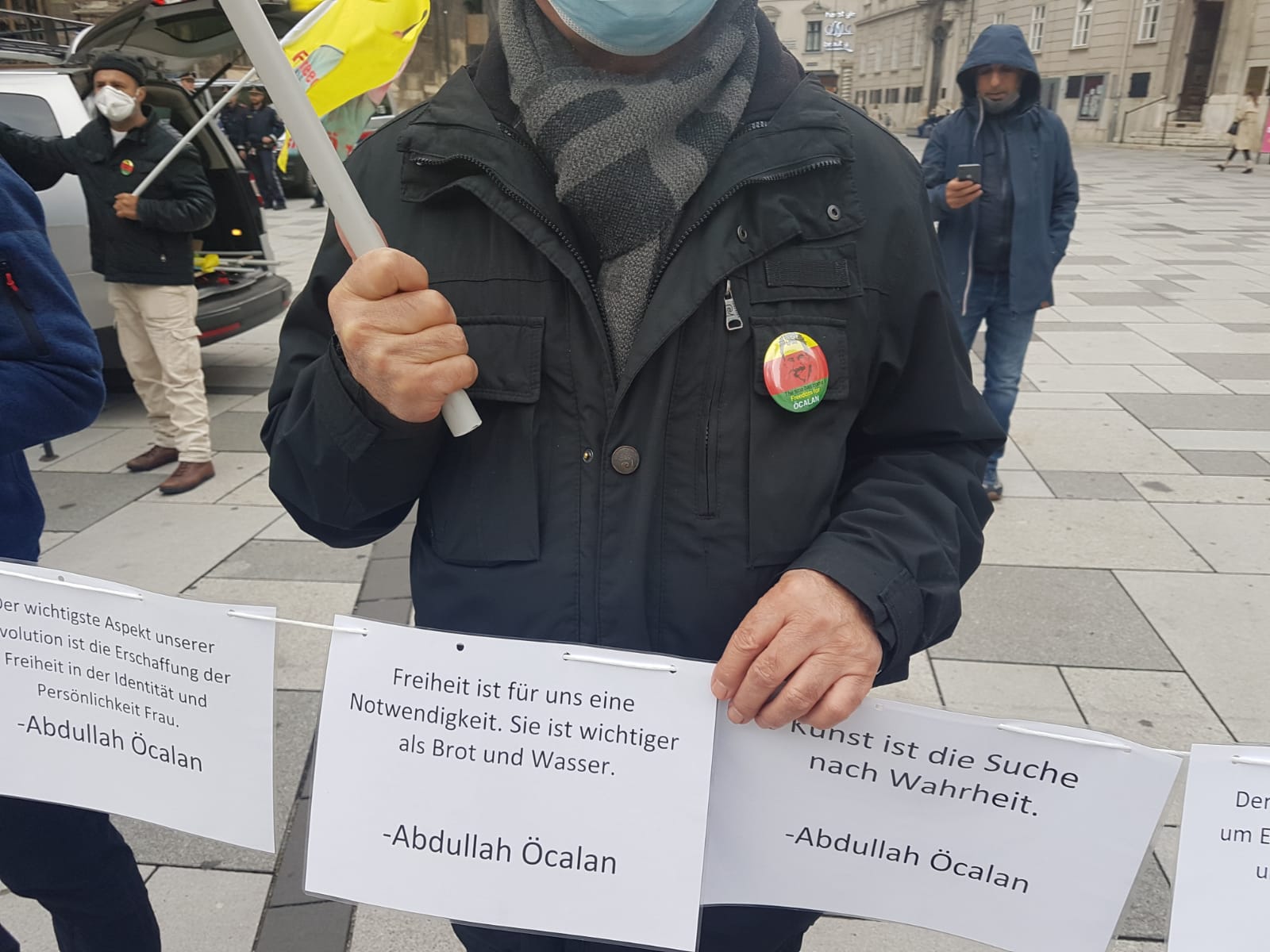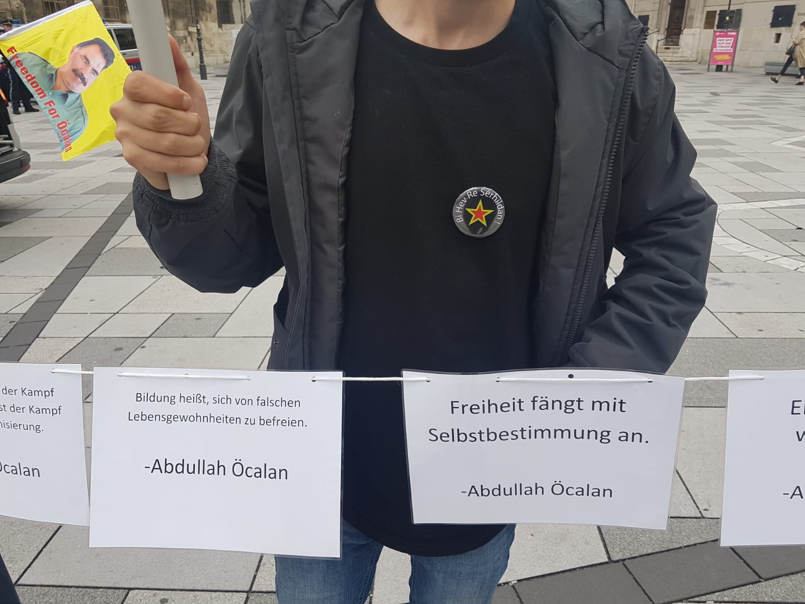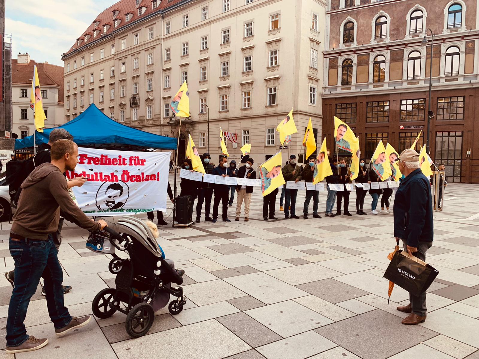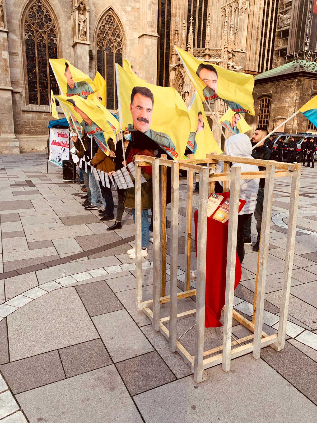 Kürt gençleri ve genç kadınları tarafından mitingde tahtadan hazırlanmış bir maket hücreye Halklar Önderi Abdullah Öcalan’ın kitapları konuldu. Bu şekilde mutlak tecride dikkat çekmek istediklerini belirten aktivistler, bunun yanı sıra Önder Öcalan’ın kadın, toplum, devlet ve hakikat ile ilgili toplam 30 tane sözünü de stand çevresine astı. Bu sözlere Avusturyalılar çok ilgi gösterdi ve bir çok insan resim çekti. Mitingde Halklar Önderi Abdullah Öcalan’a uygulanan mutlak tecriti anlatan bir bildiri okundu.