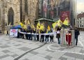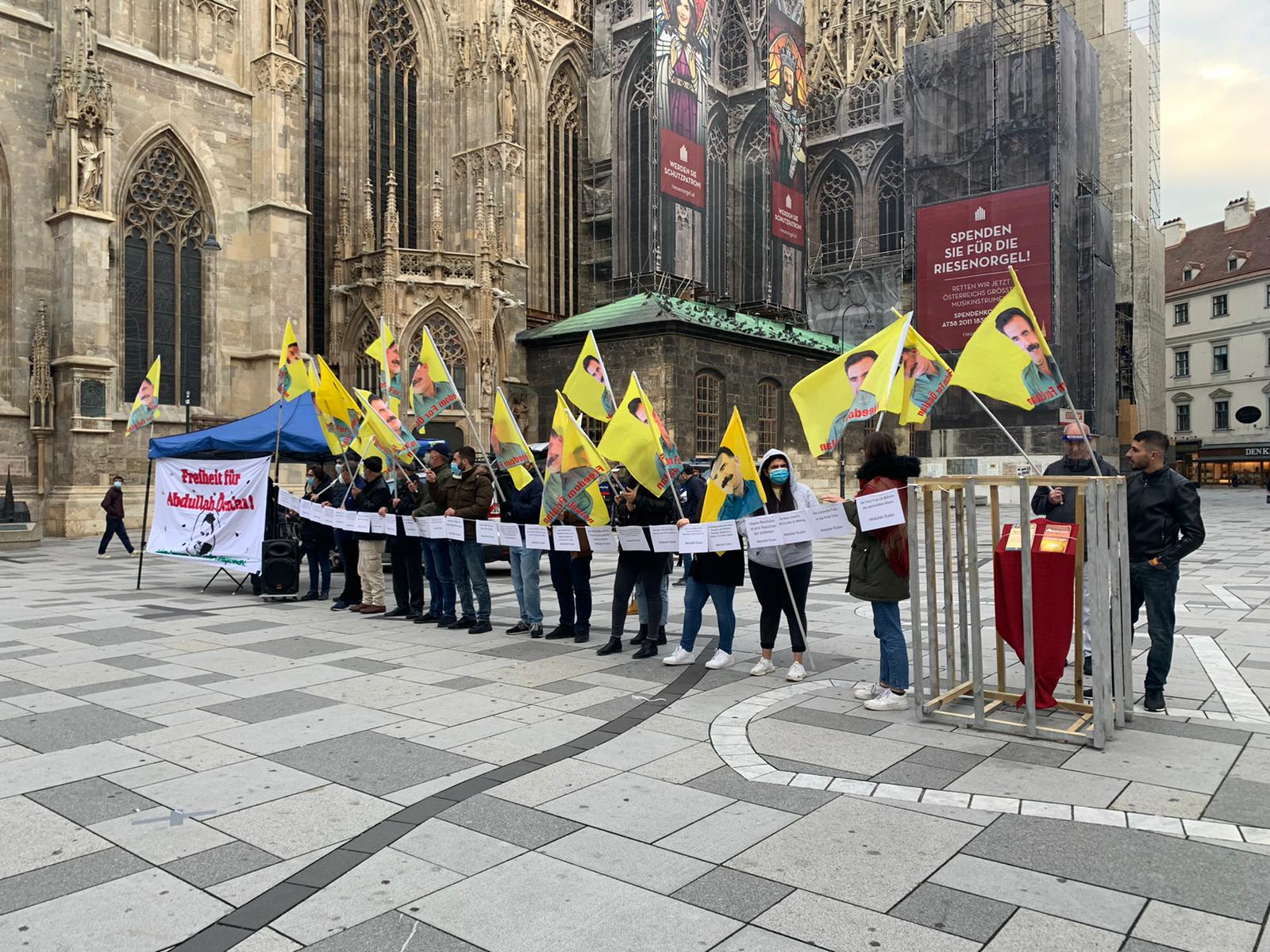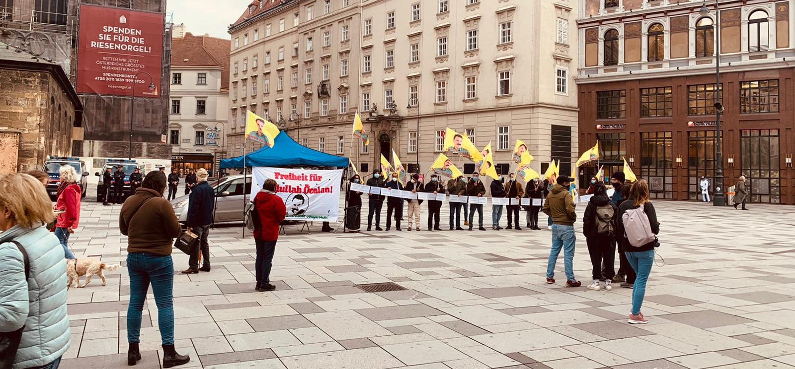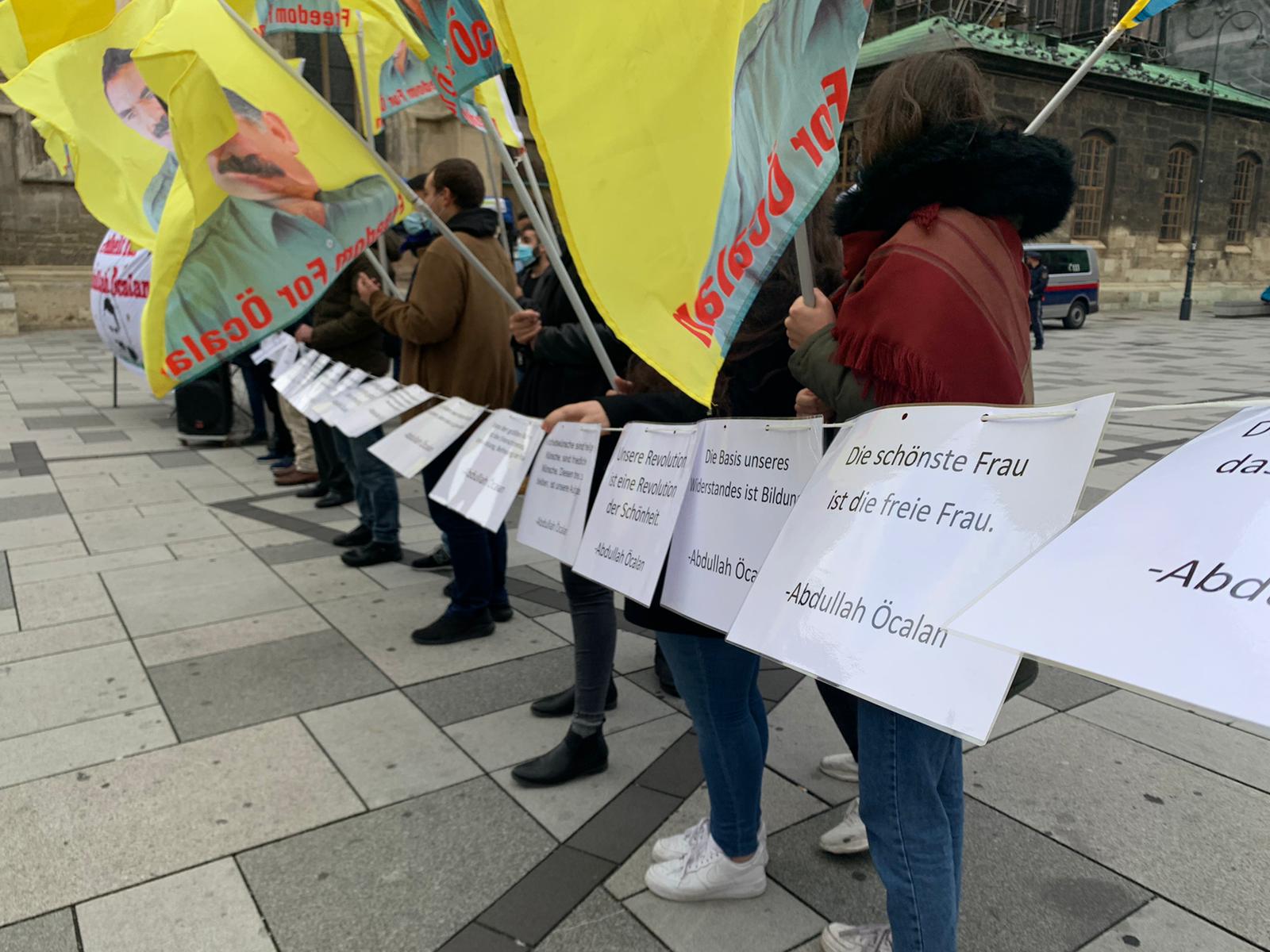 Miting saat 17:00’de Stephansplatz’da “Bi Hev Re Serhildan” hamlesi kapsamında başladı. Halklar Önderi Abdullah Öcalan’ın sarı posterlerin tutulduğu mitingde “Abdullah Öcalan’a özgürlük. Düşünceler bastırılamaz” yazılı pankart asıldı.