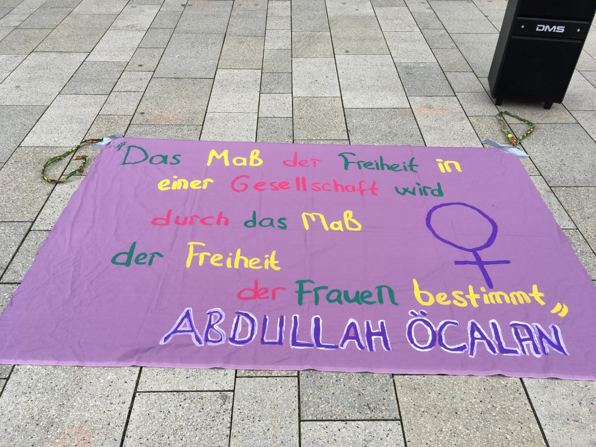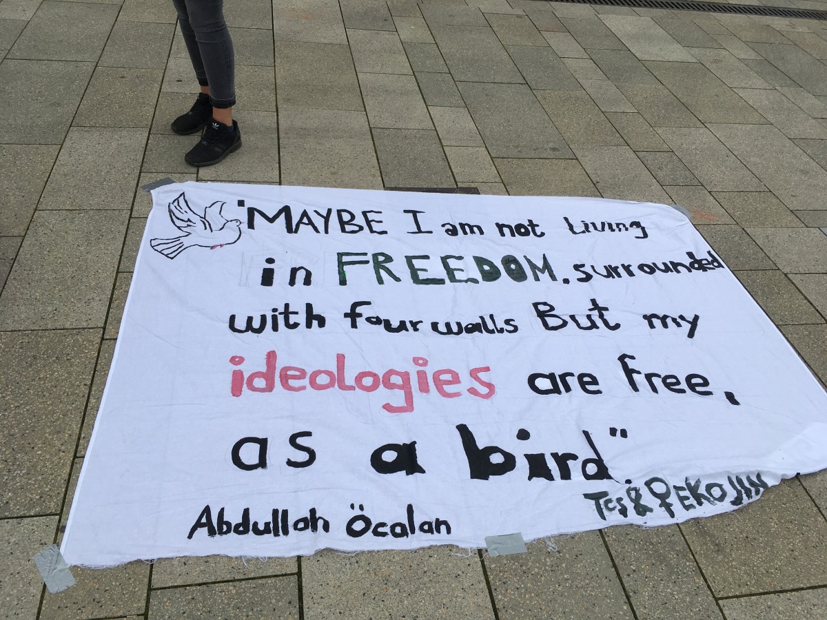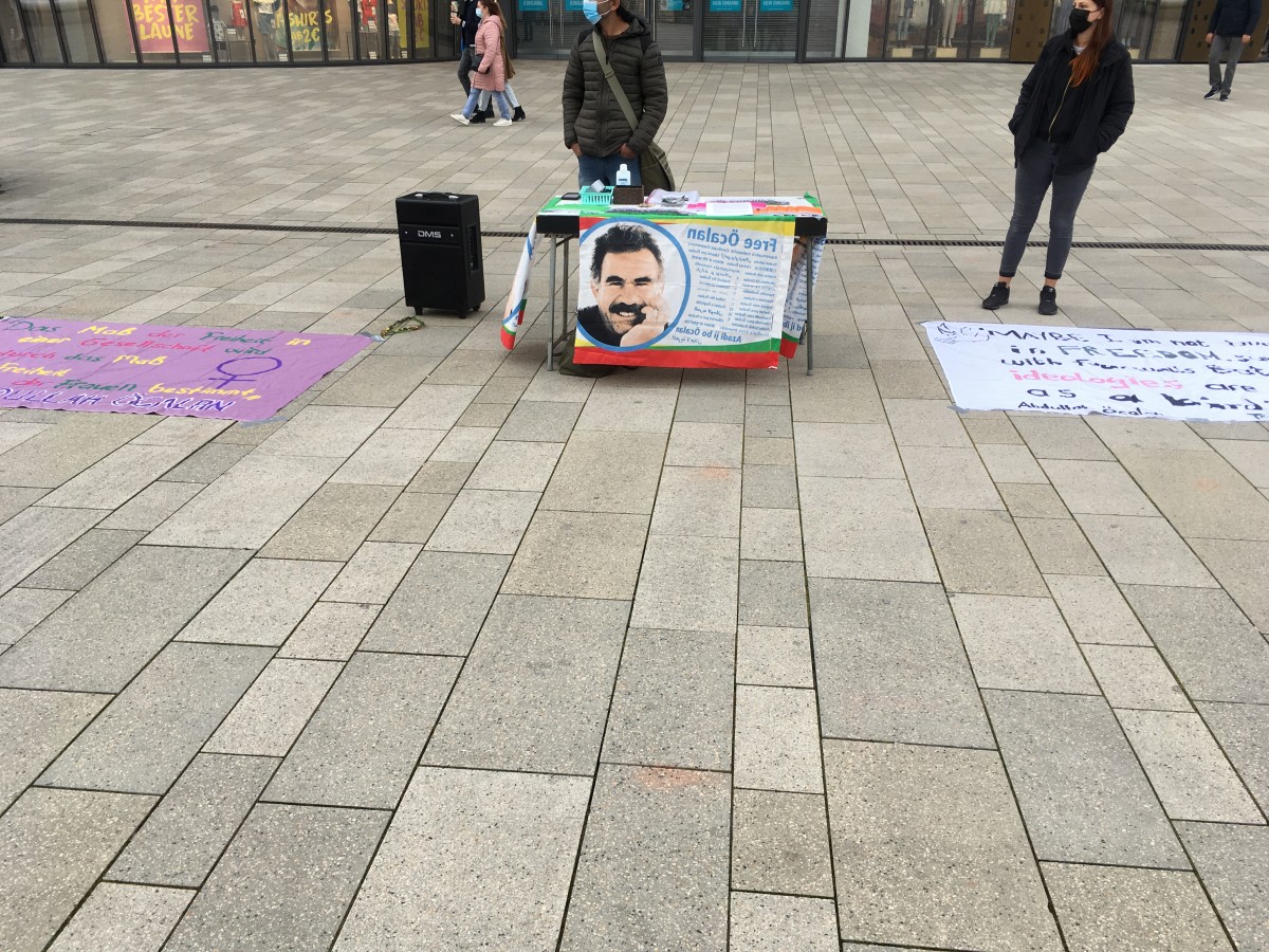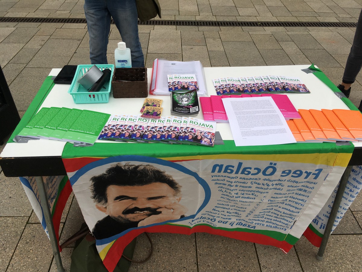 Almanca ve İngilizce pankartların yanı sıra stantda Önder Öcalan’ın resmi ve stickerları da yer aldı. Kürt gençleri olarak Önder Öcalan’ın fiziki özgürlüğünü talep ettiklerini belirten gençler, akşam saatlerine kadar stant çalışmalarına devam ettiler.