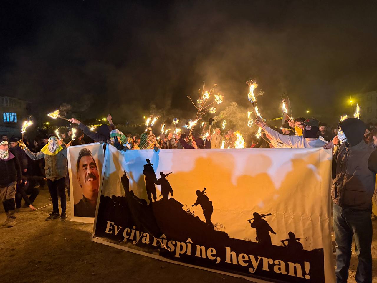 Gençler sloganlar eşliğinde Önder APO posteriyle ve üzerinde “Ev çiya ruspî ne heyran” yazılı pankartla kutlama alanına giriş yaptılar. Alanda ise gençler tarafından ateşle büyük harflerle APO yazıldı.