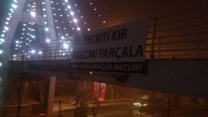 HDP Wan Gençlik Meclisi üyeleri tecride karşı karayolu üzerinde bulunan köprüye pankart astı.