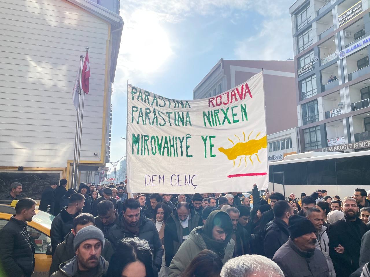 WAN – Demokratik Kurumlar Platformu öncülüğünde Wan’da düzenlenen eylemlerde, “Halep’te saldırı Türkiye’de barış olmaz. Nasıl 2014’de Kobanê’yi savunduysak bugün de Rojava’yı savunacağız” denildi.