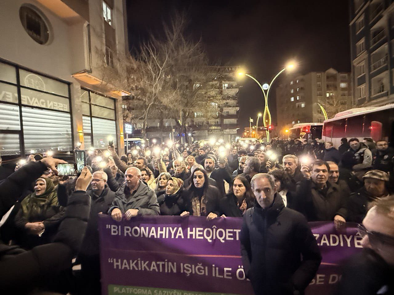 Ardından konuşan DEM Parti milletvekili Zülküf Uçar, “15 Şubat komplosunu kınıyoruz. Ortadoğu’ya, dünyaya çözüm sunan Sayın Abdullah Öcalan’a yönelik komplo uygulanmasını kabul etmiyoruz. Komployu Sayın Abdullah Öcalan direnişle yerle bir etti. Sayın Abdullah Öcalan’ın geliştirdiği varlık mücadelesi etrafında Kürt halkı kenetlendi. Bugün artık varlık kesinleşti şimdi sıra Sayın Abdullah Öcalan ve Kürt halkının özgürlüğünde. İmralı’nın ortaya koyduğu direnişi sahiplenerek selamlıyoruz” dedi.