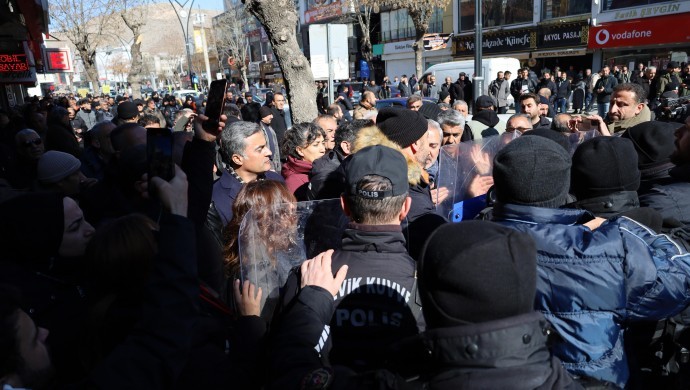 Wan Büyükşehir Belediyesi’ne kayyım atanmasının ardından kentte protesto eylemleri başladı. Beşyol Meydanı’nda bir araya gelen aralarında DEM Parti Grup Başkanvekili Gülistan Kılıç Koçyiğit, milletvekilleri, belediye eşbaşkanları ile çok sayıda kişi yürüyüşe geçmek istedi. Kitleyi çembere alan polis yürüyüşe izin verilmezken, birçok kişi ise darp edildi. Bunun üzerine çevrede bulunan halk, alkış ve sloganlarla yürüyüşe destek verdi.