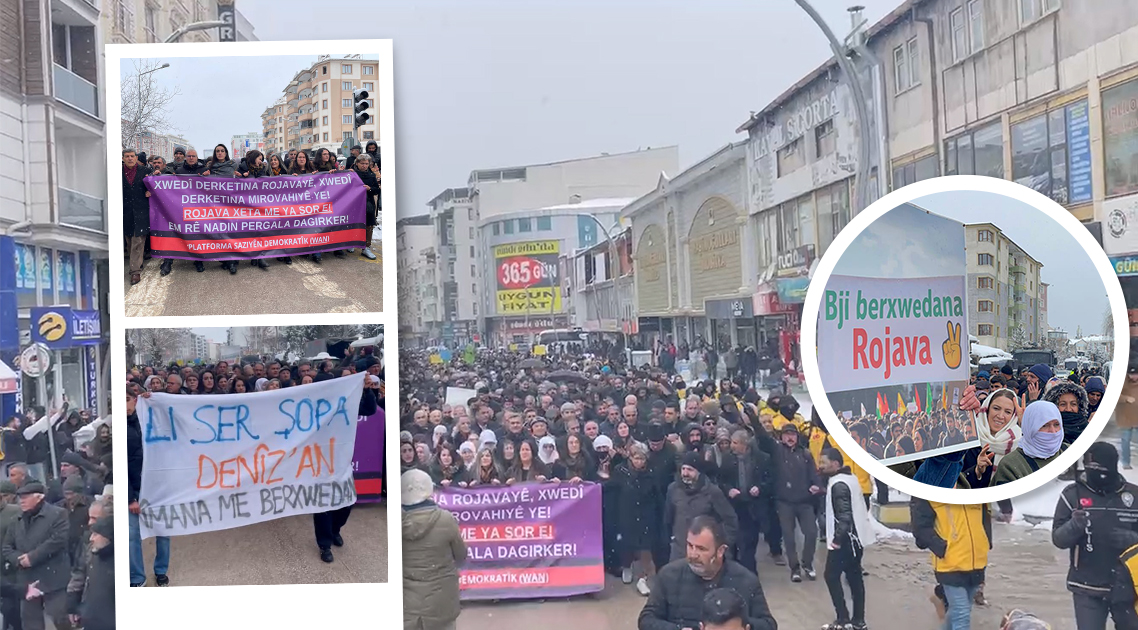 Wan’da Demokratik Kurumlar Platformu öncülüğünde HTŞ destekli grupların Halep’e ve Kuzey ve Doğu Suriye’ye yönelik saldırıları yaptığı yürüyüş ile protesto etti. Kurtuluş Parkı’nda toplanan binler, “Xwedî derketina Rojava xwedî derketina mirovahiyê ye, Rojava xeta me ya sore, em rê nadin dagirkerî” pankartıyla yürüdü. Yürüyüşte gençler, “Li ser şopa Denîzan îmana me berxwedan” pankartını açarken, kitle “direniş alanlarında çetelere geçit yok” dövizleri kaldırdı.