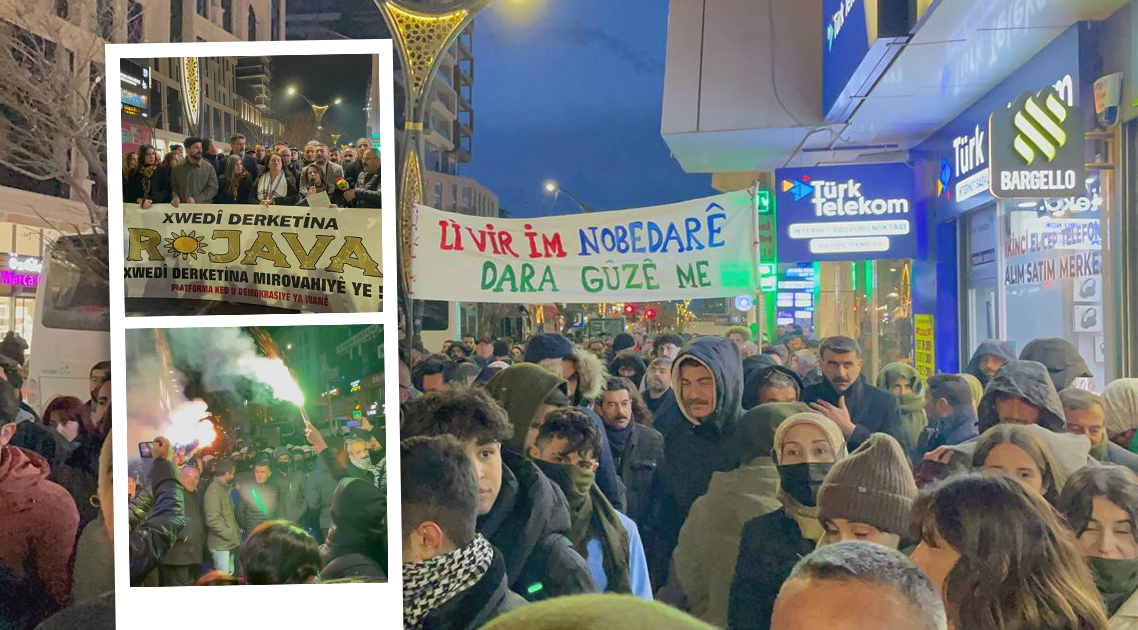 WAN – Wan Merkez’de Perihan AVM önünde, Emek ve Demokrasi Platformu öncülüğünde, HTŞ ve Türk devletine bağlı çetelerin Halep’e ve Rojava’ya dönük katliam saldırılarını protesto etmek amaçlı yürüyüş gerçekleştiriliyor.