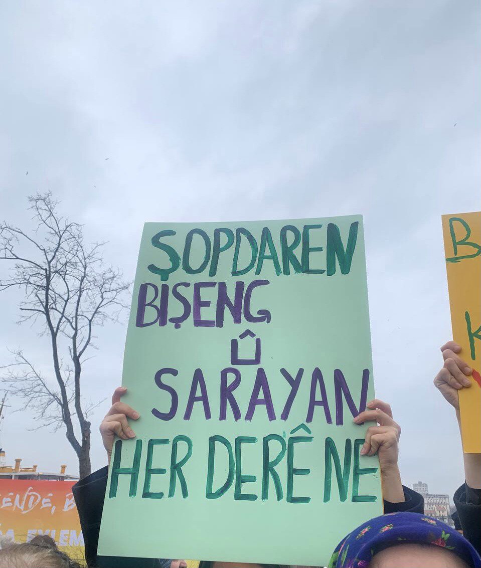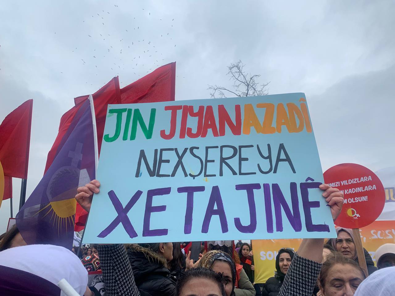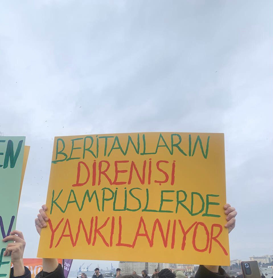 Üniversitenin Genç Kadınlar örgütlenmesine üye olan Xeta Jinê üyeleri de sahada yerini aldı ve genç kadınların renkleriyle,’Bişeng ve Saranın Takipçileri Her Yerde’, ‘Di Xeta Jinê de Ber Bi Şoreşa Jinê’ ve ‘Berîtanların Direnişi Kampüslerde Yankılanıyor’ diye yazılı pankart ve sloganlar taşıdı. Açılan pankart ve sloganlarla “Mücadelemiz her zaman vardır ve her zaman da olacaktır” ifadeleri kullanıldı. Kadın rengiyle donatılan alan, ataerkillik bilincine karşı yükselen kadınların tavırlarıyla erkek egemenliğine güçlü bir tepkiydi. Böylece kadınlar alanları doldurarak, birleşerek ekilen ataerkil bilinci ortadan kaldıracaklarını belirlediler.