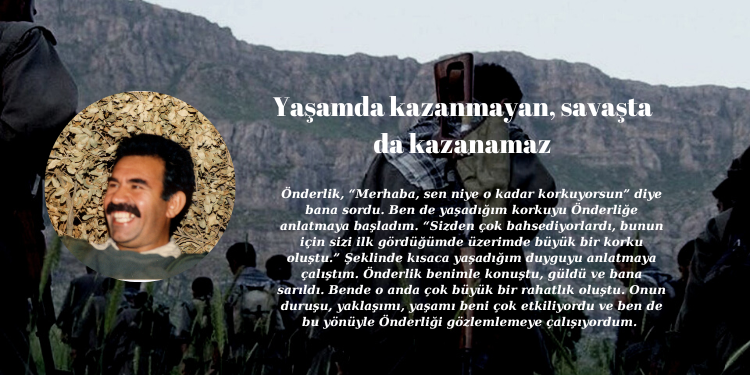 Önderliğin yaşamdaki duruşu beni çok etkiliyordu. Her zaman insanların değişeceğine ve kazanılacağına inanıyordu. Diyordu; “İnsandır, hata yapabilir ya da onun zayıflıkları olabilir. Ama önemli olan bunu nasıl aşacağı ve kendisini yeniden nasıl örgütleyeceğidir. Kendi içerisinde güdüsel yaşayacağına, her şeyi bir aşk düzeyinde ele almalı ve yaşamalıdır. Zayıflıklarıyla yaşayacağına, kendisiyle büyük bir savaş içerisine girsin. Kendisini geliştirmeyen bir insan, sonunda ya kaçar ya da intihar eder.” Bir ara bazı sorunlar yaşandı. Bunun üzerine Önderlik çözümlemeye başladı ve dedi ki; “Sizler kendinizi özgür kılmamışsınız, iki kişi yan yana oturdu mu, mimikleri ve yaklaşımlarından bu gerçeklik ortaya çıkıyor. Bir kadın ve erkek bir araya geldi mi, büyük çirkinlikler yaşayabiliyor. Bunu görmelisiniz ve dikkatli olmalısınız. Sizler erkeğin kurnazlığından ve kadının geriliğinden kendinizi korumalısınız.” Önderliğin bu sözü beni çok etkilemiş ve düşündürtmüştü. Bu sözü halen defterimde yazılıdır. Erkeğin ve kadının gerçekliğini çözümlüyordu. Önderlik “Sizi örgütsüzlüğe, köleliğe, resmiyetsizliğe, ciddiyetsizliğe çeken ve yaşamınızla oynayan erkeği kabul etmemelisiniz. Tarihsel kurnazlığını, Enki gerçekliğini iyi anlamalısınız. Kendisini yaşama dayatan kadını da kabul etmemelisiniz” diyordu. Önderlik yaşamsal olarak bu gerçeklikleri çok iyi görüyordu. Bir erkeğin ve bir kadının yaklaşımını iyi tanıyordu. Bunu eleştirip, çözümlemeye tabi tutuyordu. Bazı kadın arkadaşların bu konuda yaşadıkları zayıflığı iyi görüyor, çözümlüyordu.