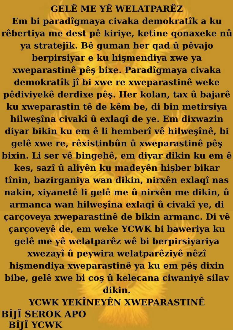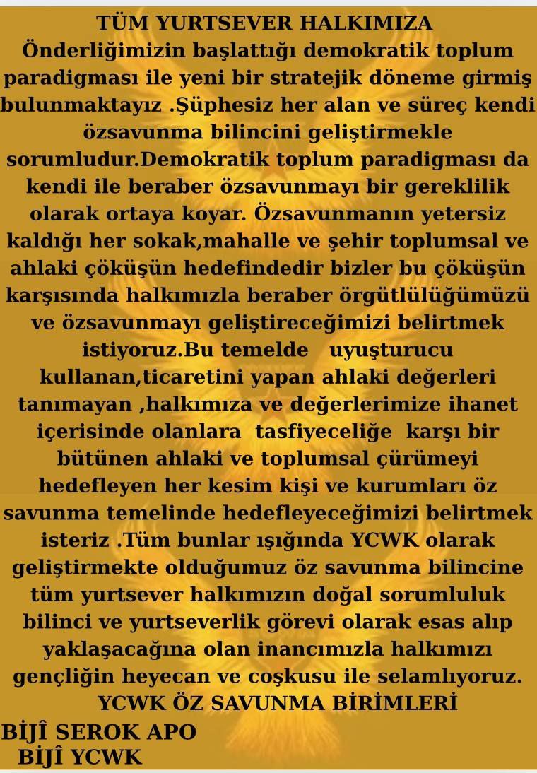 “YCWK Öz Savunma birimlerimiz, İstanbul’un Başakşehir ilçesinde öz savunma ve örgütlenmeye dair bildiriler dağıttı. Tüm Yurtsever halkımızı uyuşturucu satan ve kullanan, ahlaki değerlerimizi hedef alan ve her türlü toplumsal çürümeye zemin yaratan kişi ve kurumlara karşı duyarlı olmaya bu temelde mücadeleyi büyütmeye çağırıyoruz. Önder APO’nun başlatmış olduğu Demokratik Toplum sürecinin vazgeçilmez yanı olan öz savunmanın, gelişmediği ve zayıf kaldığı her alanda biliyoruz ki toplumsal çürümenin artacağı, ahlaki değerlerin hedef alınacağıdır. Öz savunmanın onurlu bir şekilde yaşamanın temeli olduğunu belirterek tüm Yurtsever halkımızı gençliğin heyecan ve coşkusu ile selamlıyoruz.”