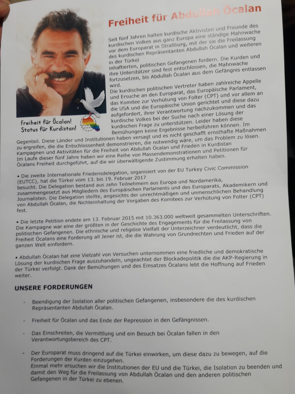 ZÜRİH – İsviçre’de yaşayan Kürdistanlı gençlerin oluşturduğu Yekîtiya Ciwanên Şoreşger dün akşam Zürih’te bildiri dağıttı. Merkezi bir güzergah olan Altstetten ve Hauptbahnhof arasında çalışan trenlere binen gençler işten çıkış saatlerinde birçok yolcuya Almanca ve İngilizce hazırladıkları bildirileri verdi. Gençlerin hazırladığı bildirilerde Halklar Önderi Öcalan’ın ağırlaştırılmış tecrit koşullarından bahsedildi. Bildirilerde “Abdullah Öcalan Kimdir?” başlığı altında Halklar Önderi’nin yaşamı ve mücadelesi anlatılırken, “Abdullah Öcalan’a Özgürlük” başlığında da gençlerin Halklar Önderi’ne özgürlük talebi yer aldı.