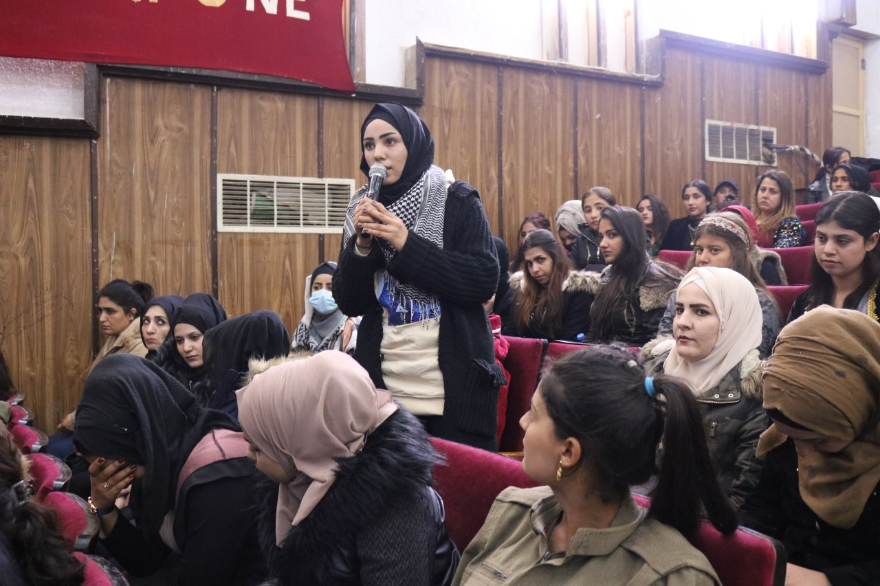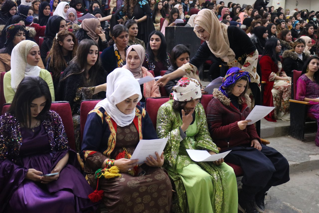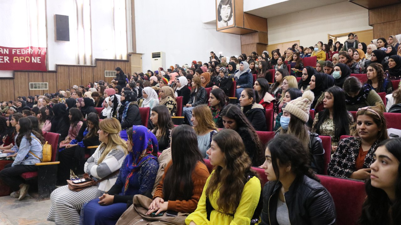 Genç kadınlar konferans salonunu “Ciwan Fedaî Rêber Apo ne” ve ” Bi rihê Şehîd Silava emê tecridê bişkînin” sloganlarıyla süsledi. Yine konferansa Kürt genç kadınlarının yanında birçok Arap genç kadın da yerel kıyafetleriyle konferansa katılım gösterdi.