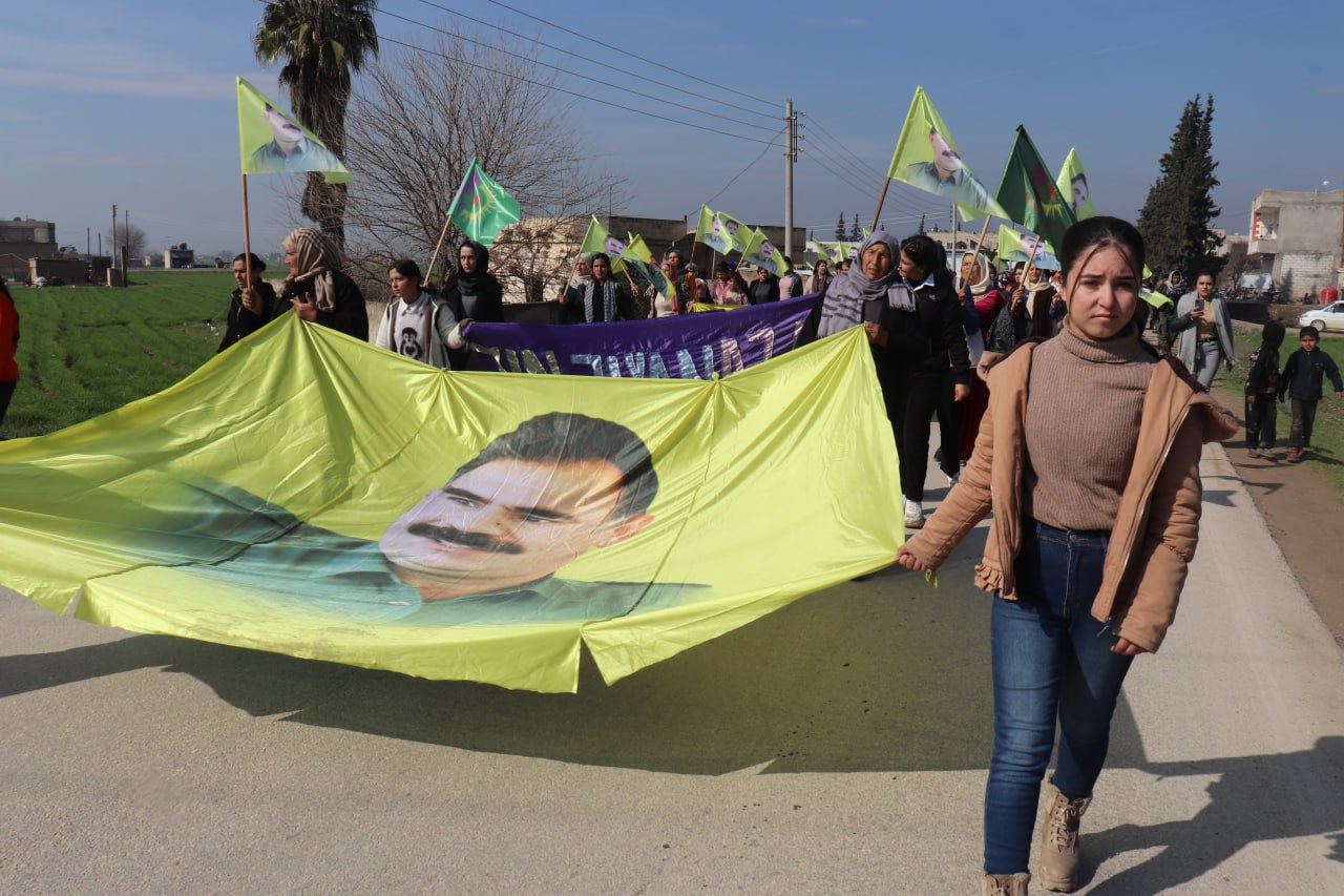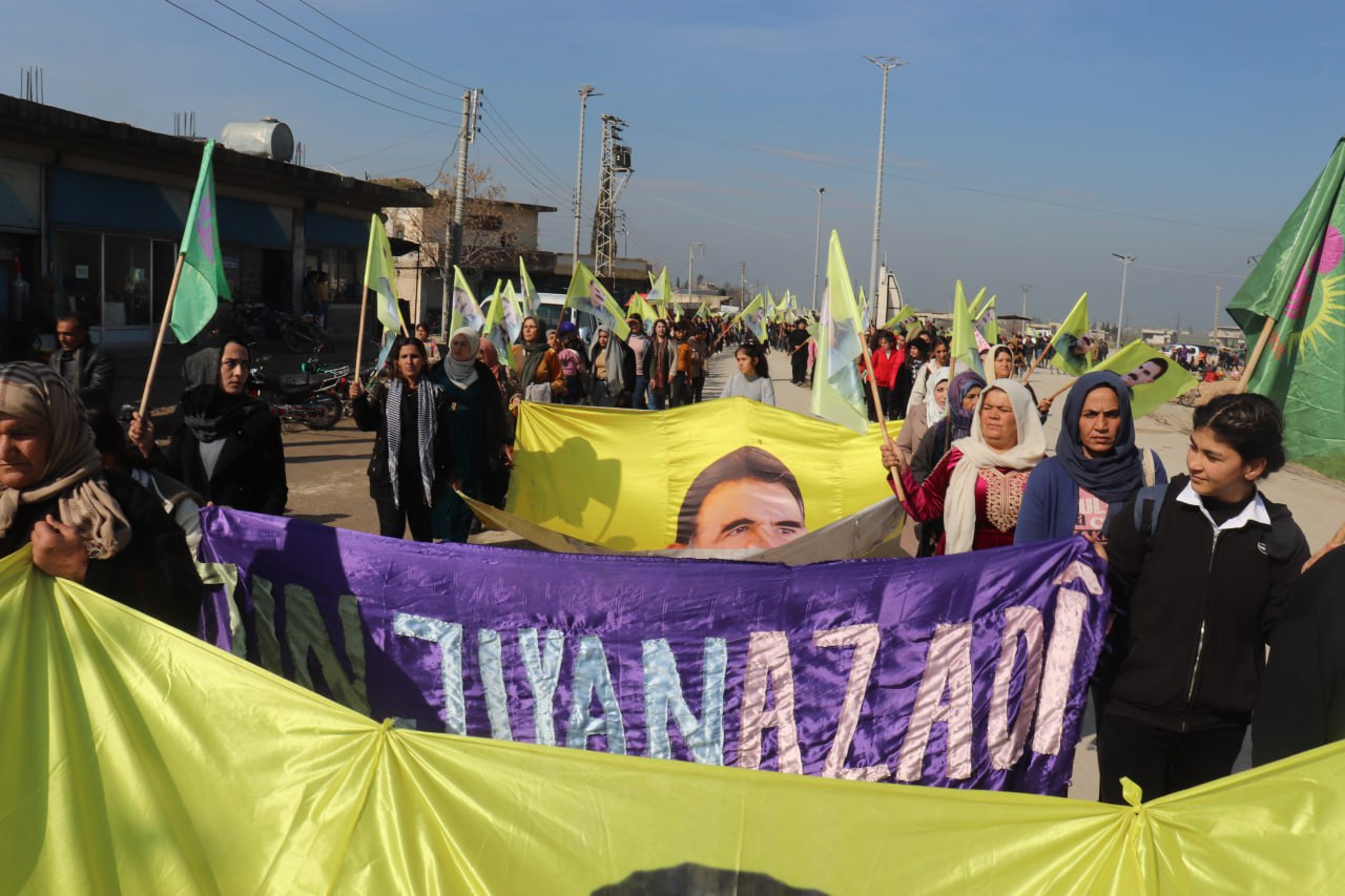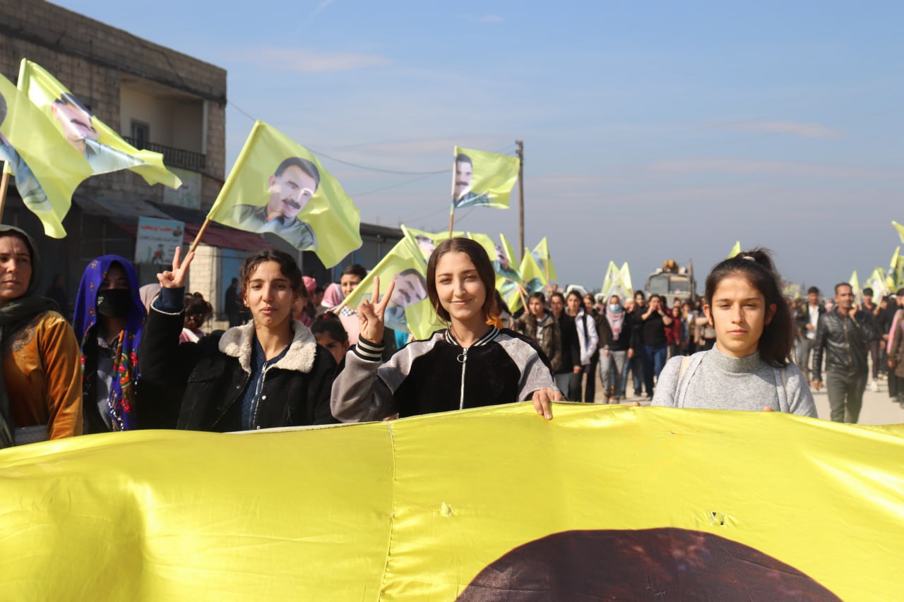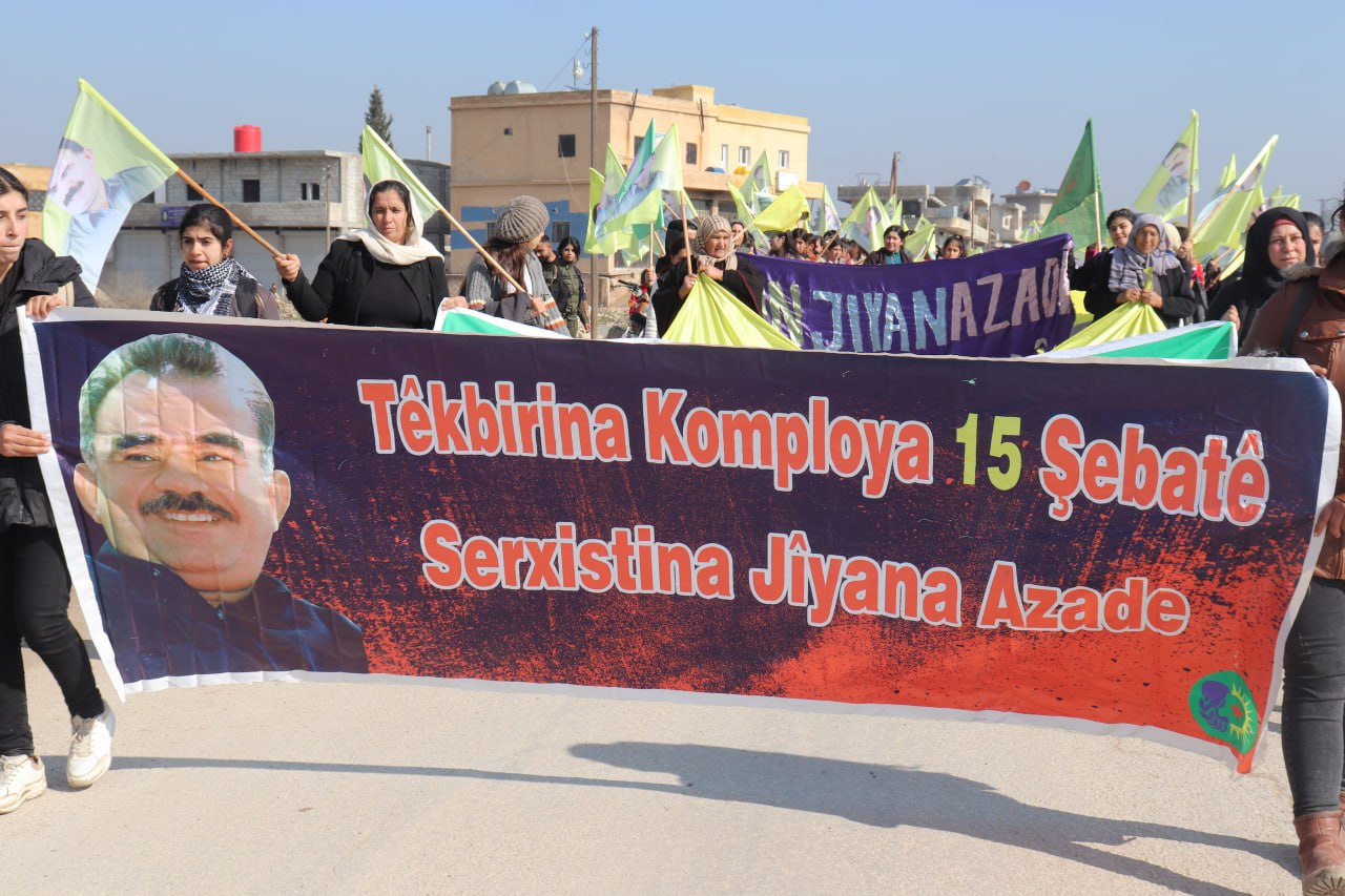 KOABANÊ- Kobanê- Yekitiya Jinên Ciwan öncülüğünde Önder Apo’nun 25 yılı aşkındır devam eden esaretine karşı Kobanê şehrinin Kenei ilçesinde yürüyüş düzenlendi. Yüzlerce genç kadının ve gençlerin katıldığı yürüyüş, mitingle başlayarak, basın açıklaması ile sona erdi. Yürüyüş boyunca Önder Apo’nun özgürlüğünü amaçlayan sloganlar atıldı. Yürüyüşte Önder Apo’nun fotoğraflarının olduğu filemelar ve üzerinde “Tekbirina Komploya 15’ê Şibatê Serxistina Jiyana Azad e” yazılan pankart taşındı.