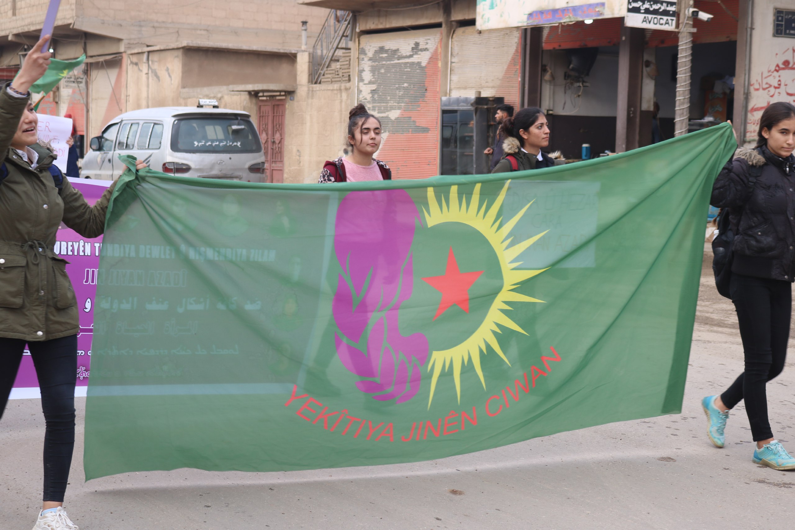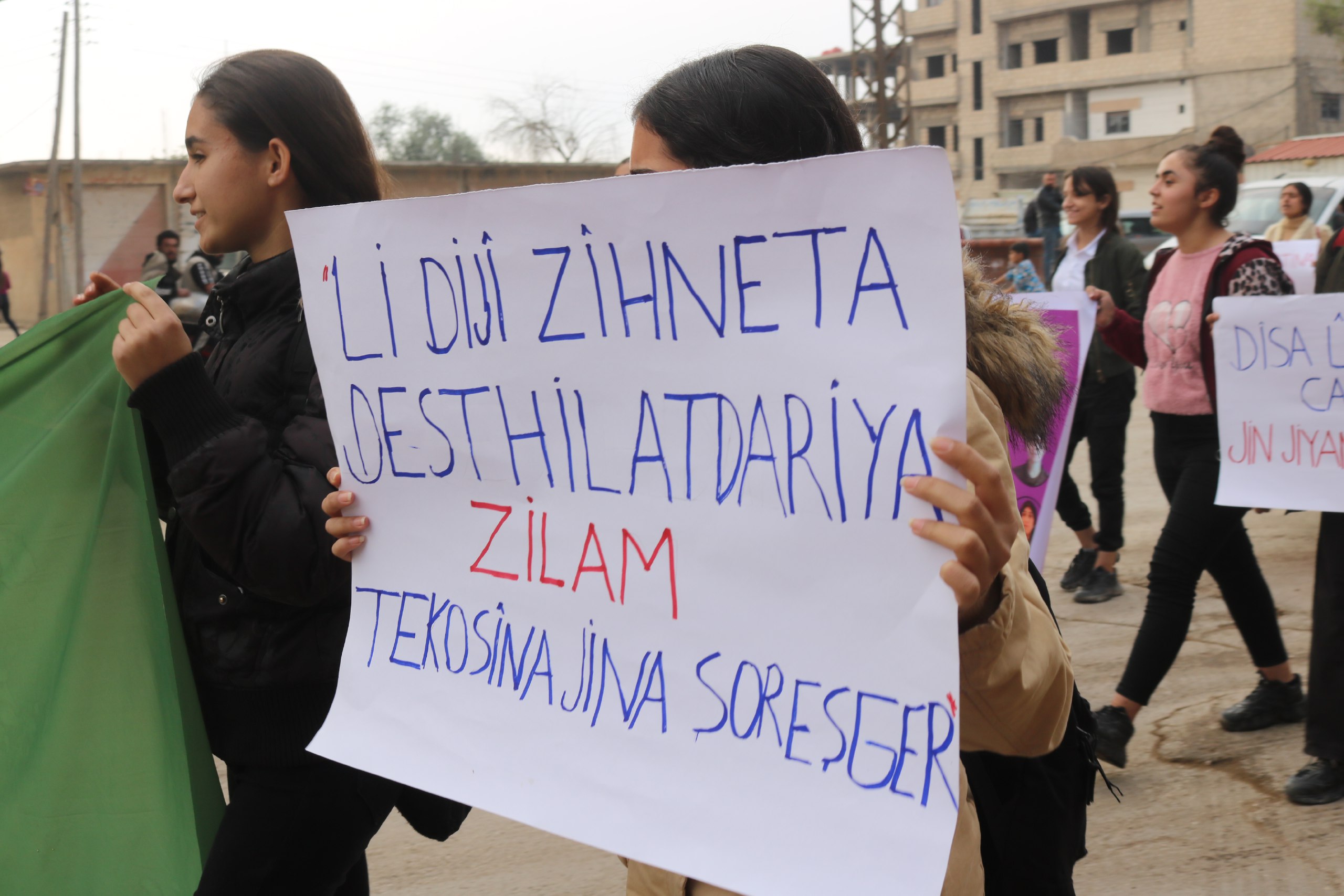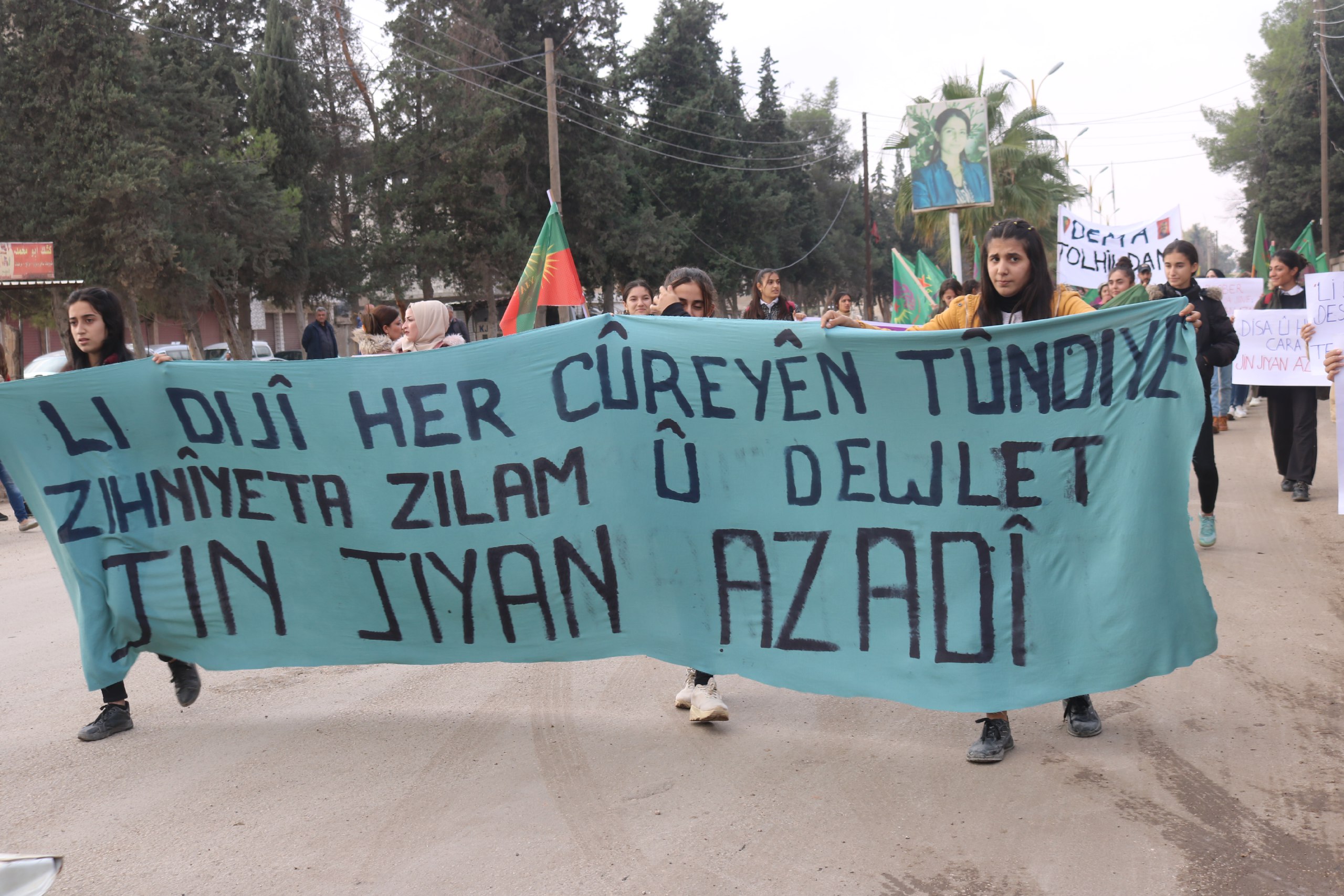 Yürüyüşe katılan genç kadınlar, Yekîtiya Jinên Ciwan ve YJA-Star bayraklarını taşıdı. Bunun dışında “Tundiya li dijî jinan sûcek li dijî mirovahiyê ye” ve “Li dijî zihniyeta baviksalarî ya paşverû tê bikoşin” yazılı pankartlar açıldı.