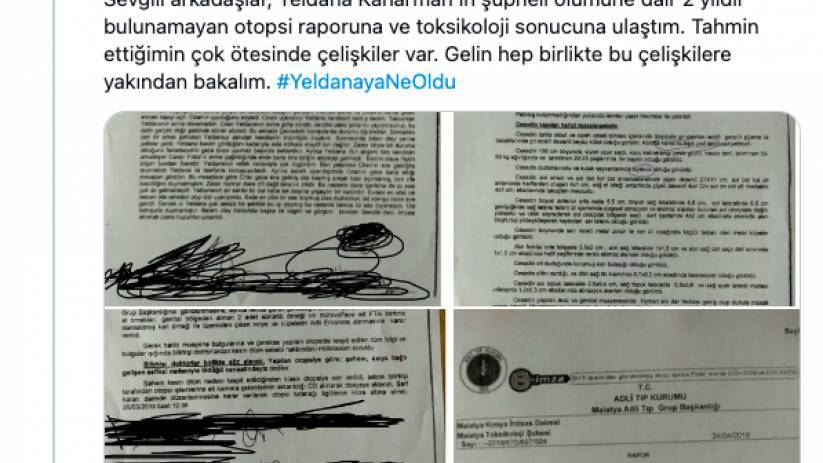 Yaşanan yeni gelişme Yeldana Kaharman’ın ölümüyle ilgili bazı soru işaretlerini tekrar gündeme getirdi. Yeldana’nın erkek arkadaşı ve ev arkadaşıyla yaptığı görüşmeleri Twitter hesabından kamuoyuna aktaran gazeteci Baransel Ağca, bugün de Yeldana’nın 2 yıldır ulaşılamayan otopsi raporunu yayımladı.