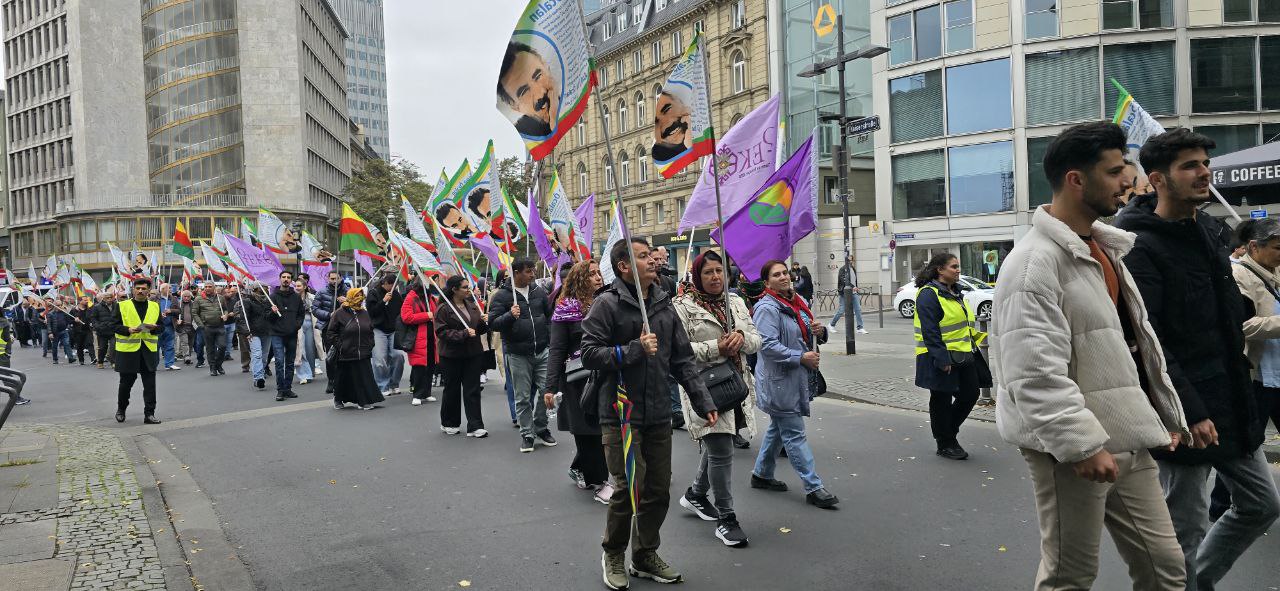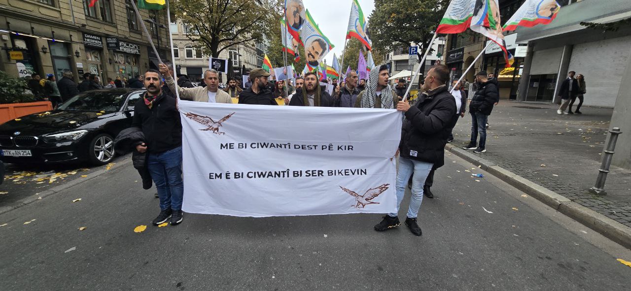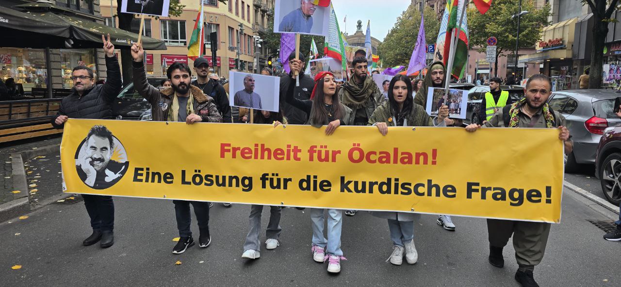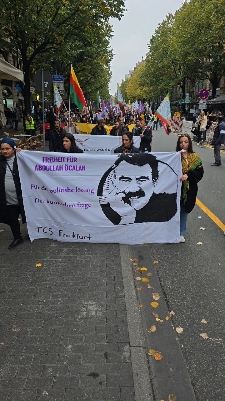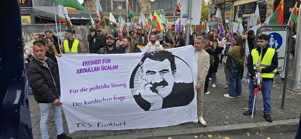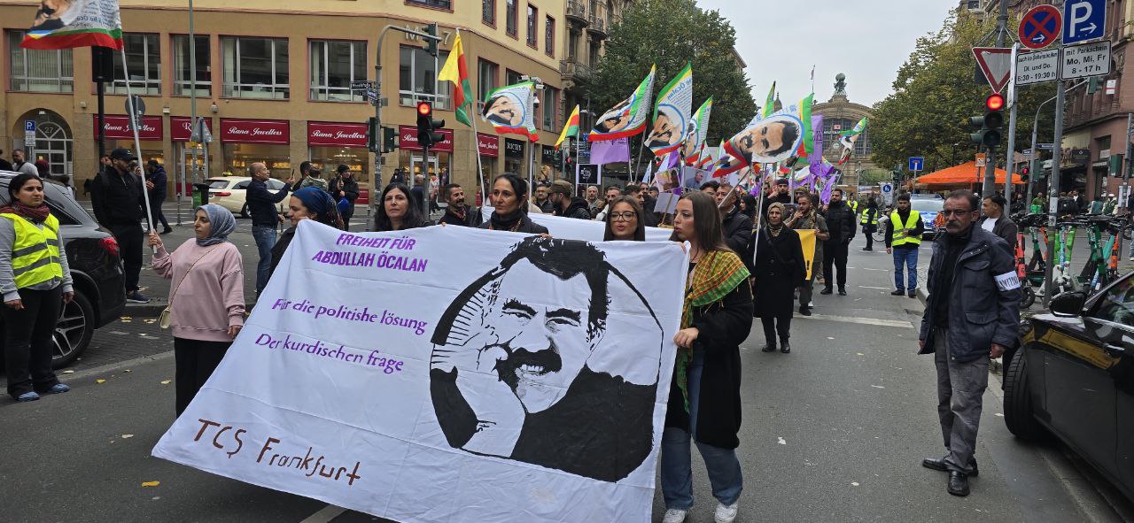 Önder APO flamaları ve dövizlerle Frankfurt Merkez Tren İstasyonunda yürüyüşe başlayan halk Yürüyüş boyunca “Bijî Serok APO”, ” Ciwan Fedayên Rêber APO ne” ve “Jin Jiyan Azadî” sloganlarını atarak yürüyüşlerini Goetheplatz’da sonlandırdı.