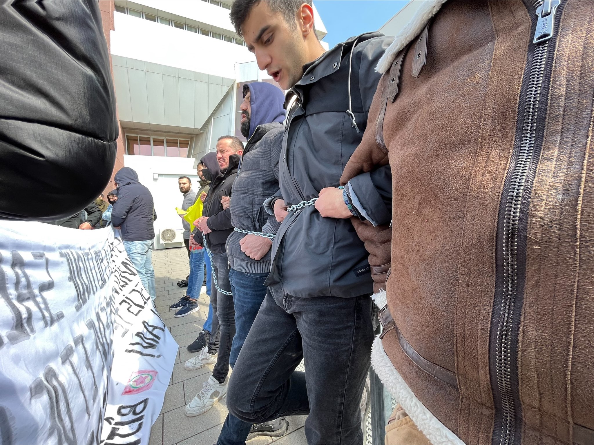 Gençler bina içerisinde yaklaşık olarak iki saat boyunca sık sık “Liberte Pour Öcalan” ve “Bijî Serok APO” sloganlarını attı. Gençler Önder Öcalan’a uygulanan sistematik ve ağırlaştırılmış tecride dikkat çekmek için kendilerini zincirlerle demirlere bağladı.