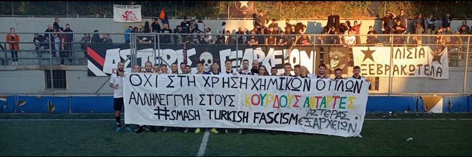 „Kürdistan da Faşist Türk Rejiminin 6 aya aşkındır devam eden kimyasal silah kullanımının savaş ahlakından uzak olduğu gibi soykırımcı faşist Türk rejiminin çöküşünü engellemek için Kürt halkı ve GERİLLASINA karşı yasaklı kimyasal silah kullanarak yenilgisini engelleyemez. Kürt Gerillaları Halklar ile Özgürlüklerini kazanacaktır. Bu kimyasal silah kullanımına sessiz kalan herkes bu rejime ortak olduğu gibi biz ΑΣΤΕΡΑΣ ΕΞΑΡΧΕΙΩΝ Takımı ve taraftarları olarak enternasyonel mücadelemiz ile bu Türk rejiminin savaş suçuna karşı Kürt GERİLLALARININ yanında olduğumuzu ve mücadelelerini benimsediğimizi belirterek Kürt ve enternasyonalist gençliğini ve halkları bu Kimyasala karşı ayağa kalkmasını ve OPCW ve insani kuruluşlarında bu kimyasal saldırılara karşı görevlerini yerine getirmelidir.“