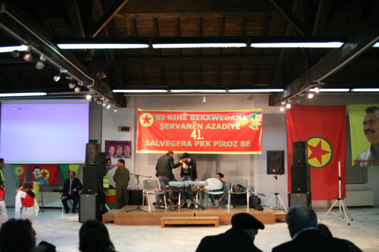 LAVRİO– Yunanistan’ın Lavrio kentinde PKK’nin kuruluş 42’inci yıldönümü coşkuyla kutlandı. Kürdistan Kültür Merkezi ve Tevgera Ciwanên Şoreşger tarafından Lavrio belediyesi kongre salonunda organize edilen kutlamaya, yüzlerce Kürdistan’lının yanı sıra sol ve sosyalist örgütler ve Yunan halkı katıldı. Salona Halklar Önderi Abdullah Öcalan ve PKK’nin öncü komutanlarında Mahsum Korkmaz’ın (Egid) dev posterleri, PKK, KCK bayrakları ve PKK’nin kuruluşunu kutlama mesajlarının yer aldığı pankartlar asıldı.