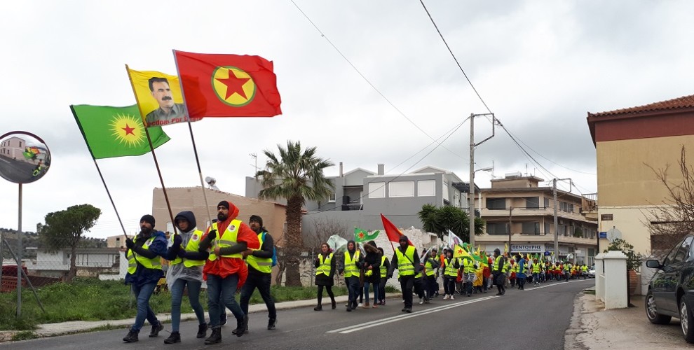 Büyük bir coşku ve moralle yürüyen gençler, devrimci marşlar eşliğinde, “Biji Serok Apo”, “Biji berxwedana zindana”, “Be Serok jiyan na be” ve Yunanca sloganlar atıldı.
