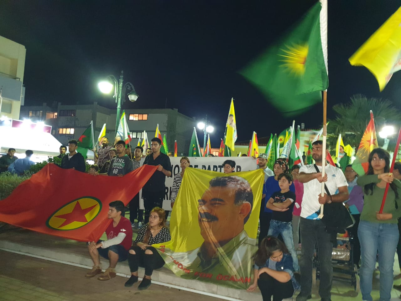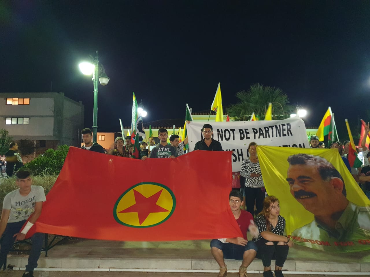 Halklar Önderi Abdullah Öcalan’ın posterleri, PKK KCK, YPG, YPJ ve TEVDEM’in bayraklarıyla yürüyen kitle sık sık “Bijî Serok Ap”, “Biji Berxwedana Rojava ve “Faşist Türkiye” gibi sloganlar attı.