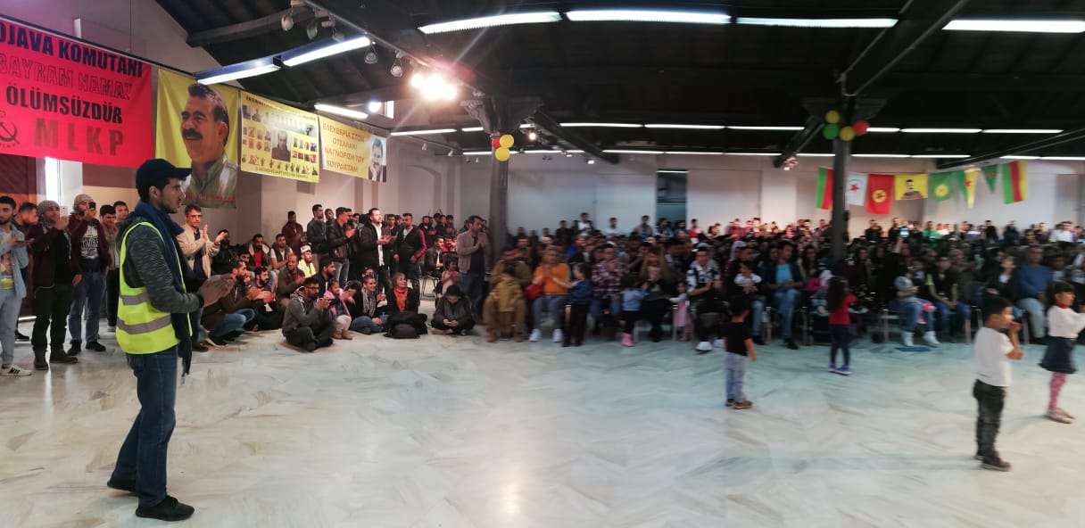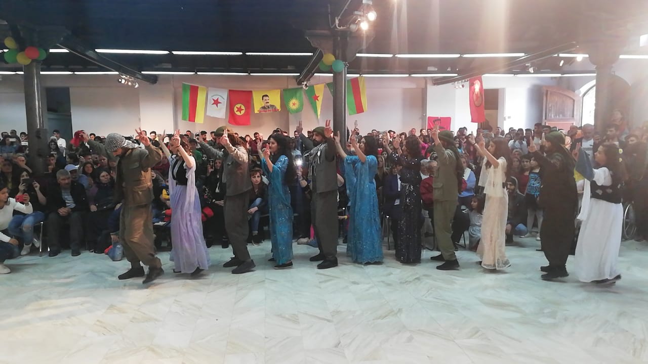 Newroz kutlaması, Halklar Önderi Abdullah Öcalan’ın üzerinde uygulanan tecridin kırmak amacıyla fedai eylem gerçekleştiren Uğur Şakar, Zülküf Gezen, Zehra Sağlam ve Ayten Beçet şahsında tüm devrim şehitleri için bir dakikalık saygı duruşu ile başladı. Alana “Enternasyonal Şehitlerimiz Ölümsüzdür”, “Newroz Pîroz be” ve “Leyla Güven Onurumuzdur” pankartları asılırken, salon önünde PKK, YPG, YPJ ve KCK bayrakları dalgalandı.