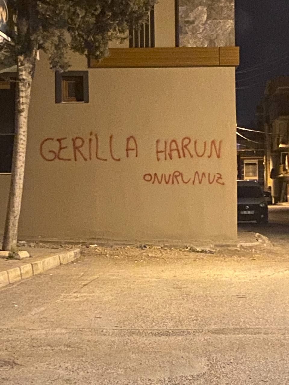 İZMİR – Yurtsever Gençlik İzmir’in Buca ilçesinde yazılama gerçekleştirerek “Gerilla Harun Onurumuzdur” dedi.