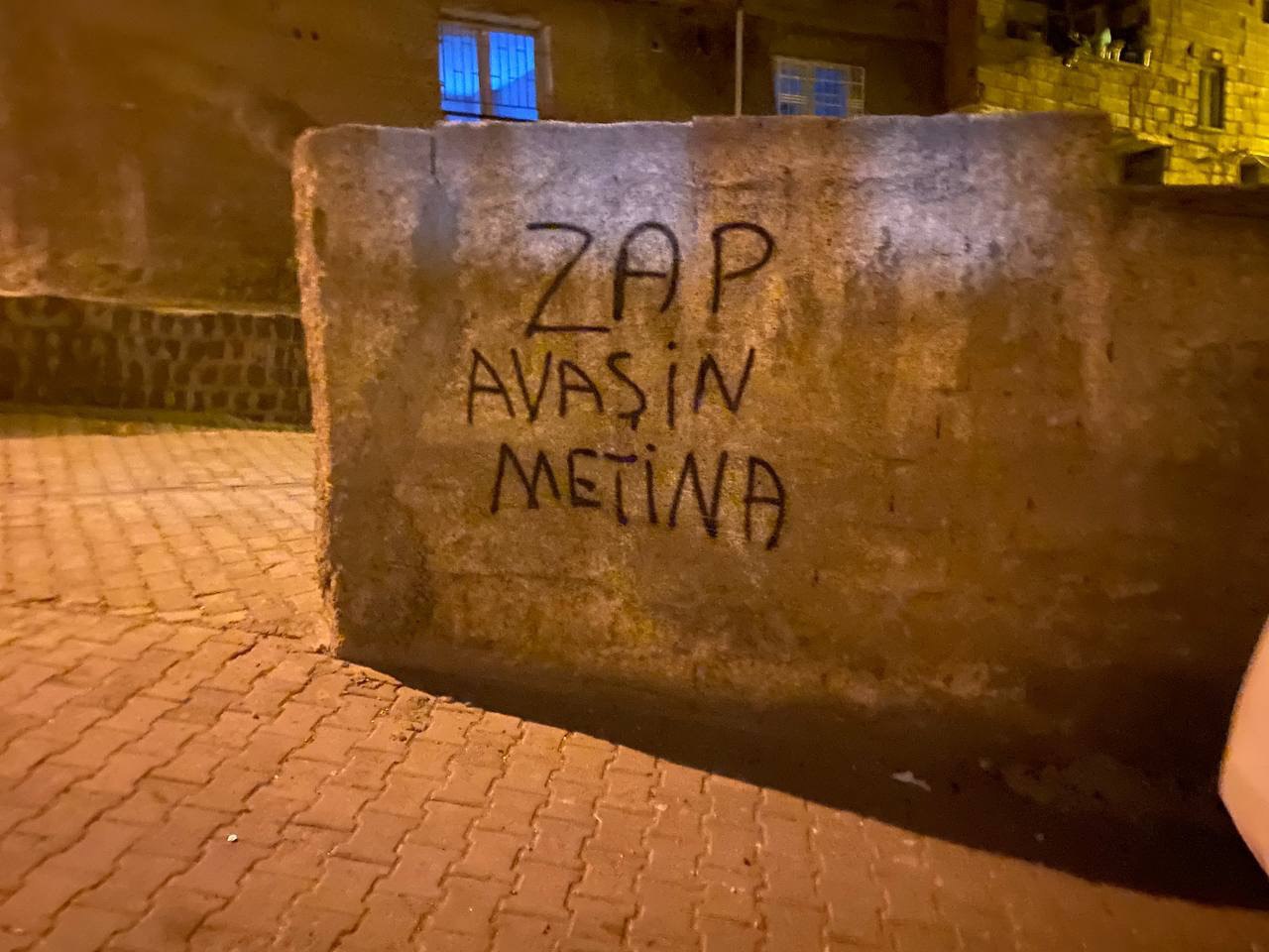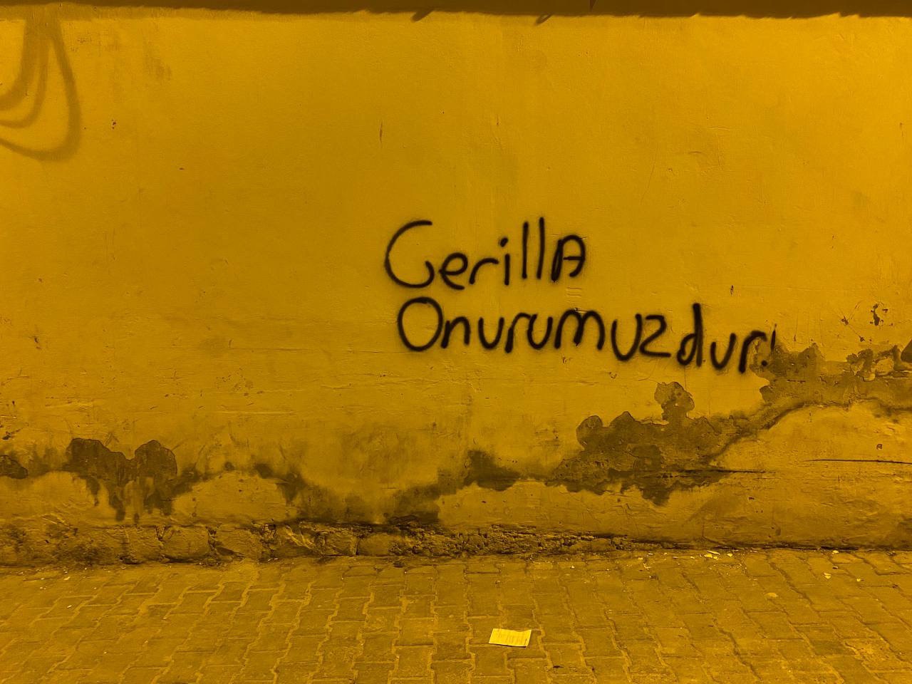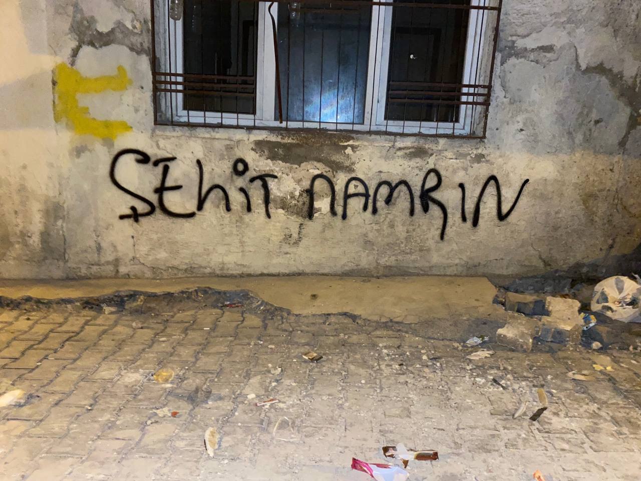 Gençler, duvarlara Kürtçe ve Türkçe, “Şehit Namirin”, “Rêvan Suruç” Bijî Serok APO” Gerilla Onurumuzdur” “Jin Jiyan Azadî” yazdı.