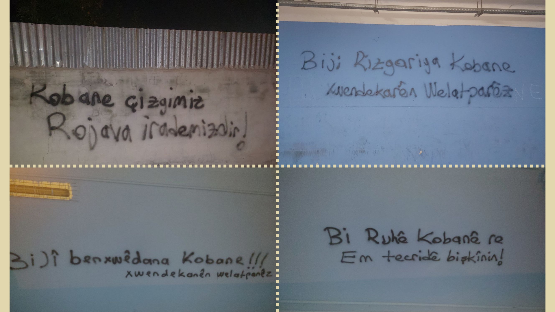 Öğrenciler tarafından duvarlara Kürtçe ” Kobane ruhuyla tecridi kıracağız” “Yaşasın Kobane Direnişi” “Kobane Çizgimiz, Rojava İrademizdir” sloganları yazıldı.