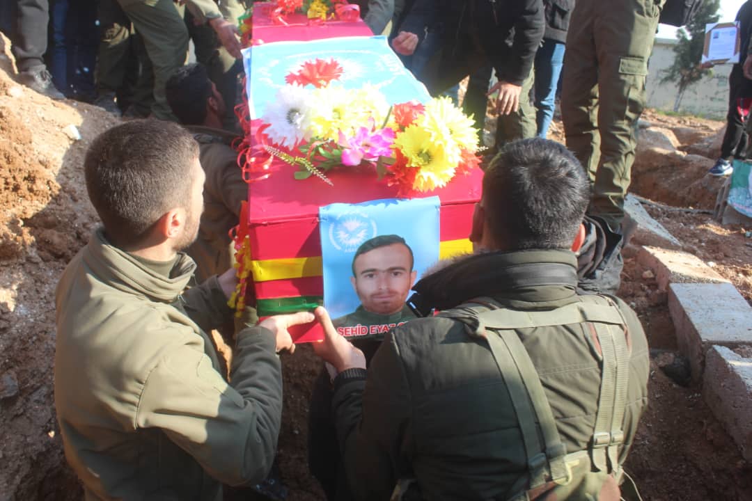 Cenaze daha sonra Şehit Rustem Cudi Şehitliği’ne doğru yola çıkarıldı. Şehitlikte yapılan törende konuşan İç Güvenlik Güçleri yöneticilerinden Mizgîn Mustafa, “Şehit Ayaz, halkını ve ülkesini savunmak için bir gün bile görevinde geri adım atmamıştır, gecesini gündüzüne katarak mücadele etmiştir” dedi.