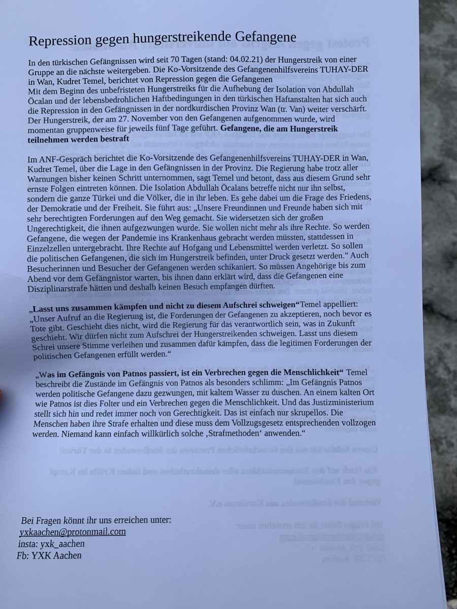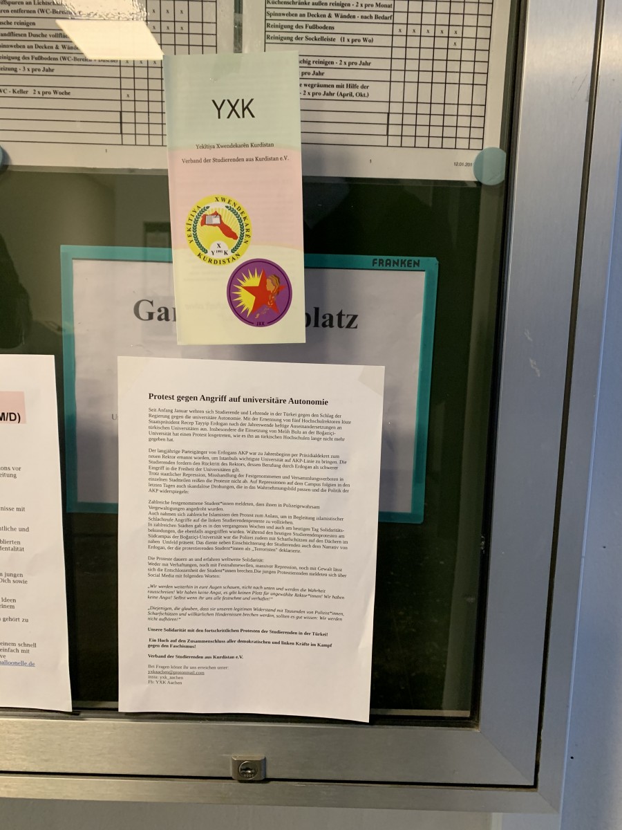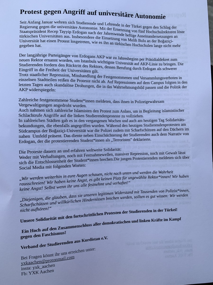Aachen’de bulunan öğrenci yurtlarında posta kutularına bildiriler bırakan gençler, Aachen öğrencilerini bir yandan Boğaziçi öğrencilerinin direnişi, diğer yandan ise Önder Öcalan’a uygulanan tecride dair bilgilendirmede bulundular. Boğaziçi öğrencilerinin demokratik ve özerk bir üniversite taleplerini desteklediklerini belirttiler.