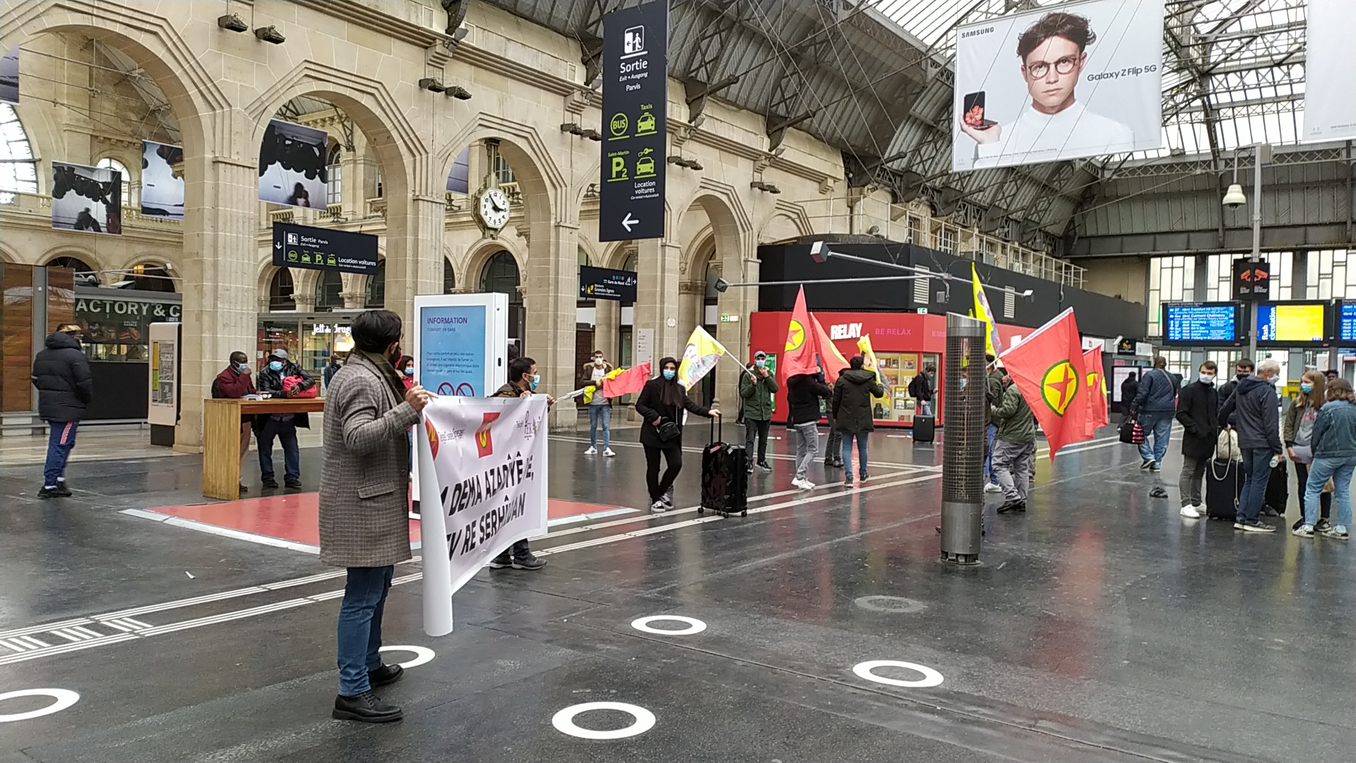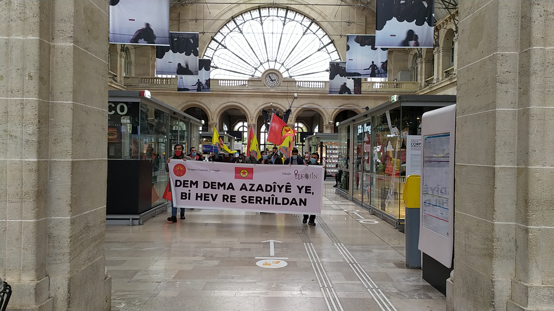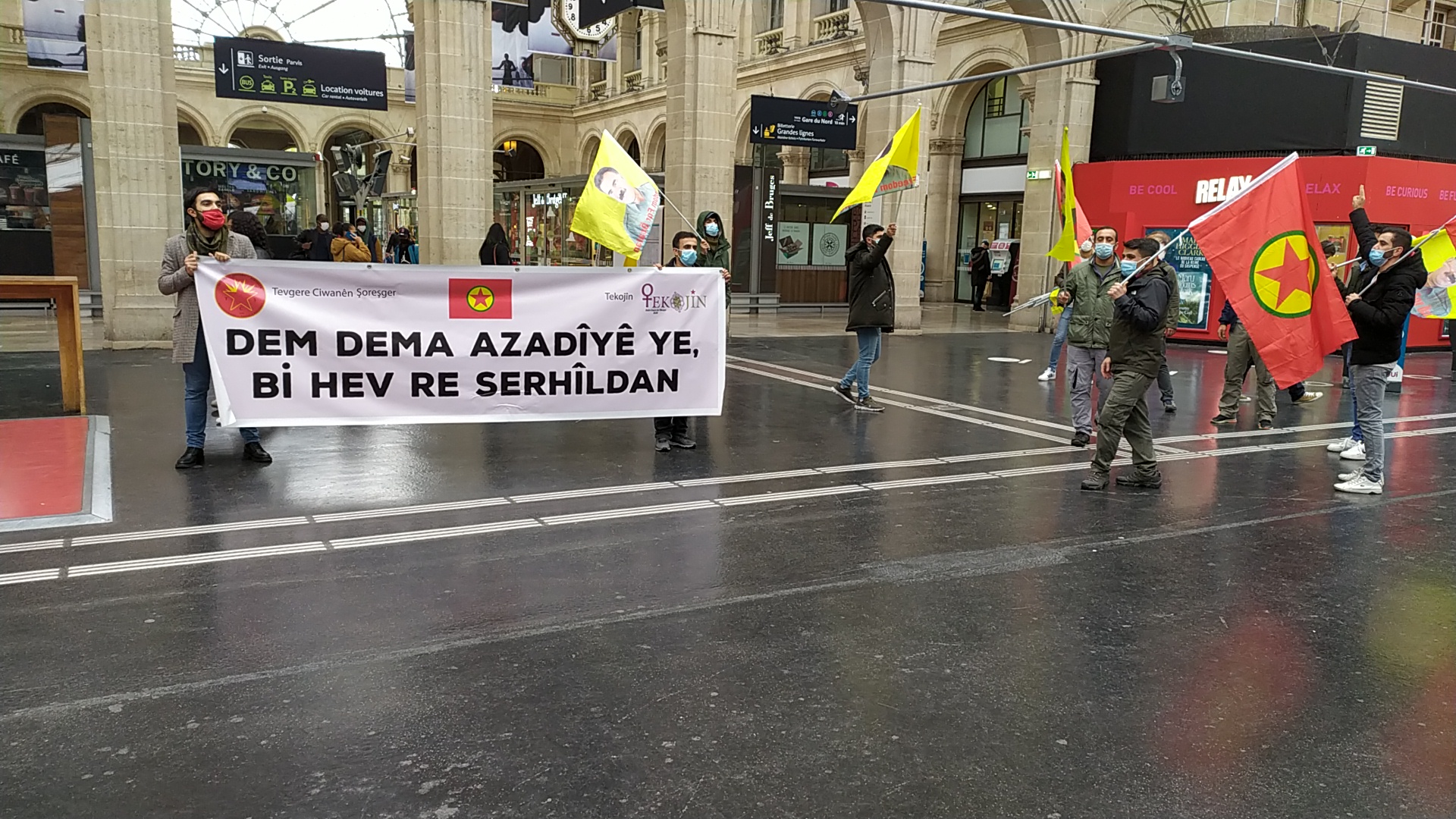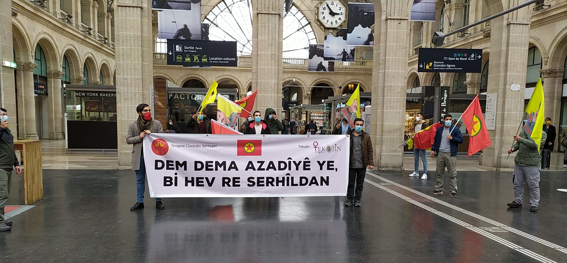 “Dem Dema Azadîyê ye – Bi Hev Re Serhildan” (Zaman, Özgürlüğün Zamanıdır – Birlikte Serhildan) pankartının açıldığı eylemde gençler, gar içerisinde bir yürüyüş gerçekleştirdi. “Liberté pour Öcalan (Öcalan’a Özgürlük)”, “Assassin Erdogan (Katil Erdoğan)”, “A Bas Le Régime Fasciste En Turquie (Kahrolsun Faşist Türk Rejimi)” sloganlarının atıldığı eylemde gençler, Halklar Önderi Abdullah Öcalan’ın posterleri ve PKK flamalarını açtı.