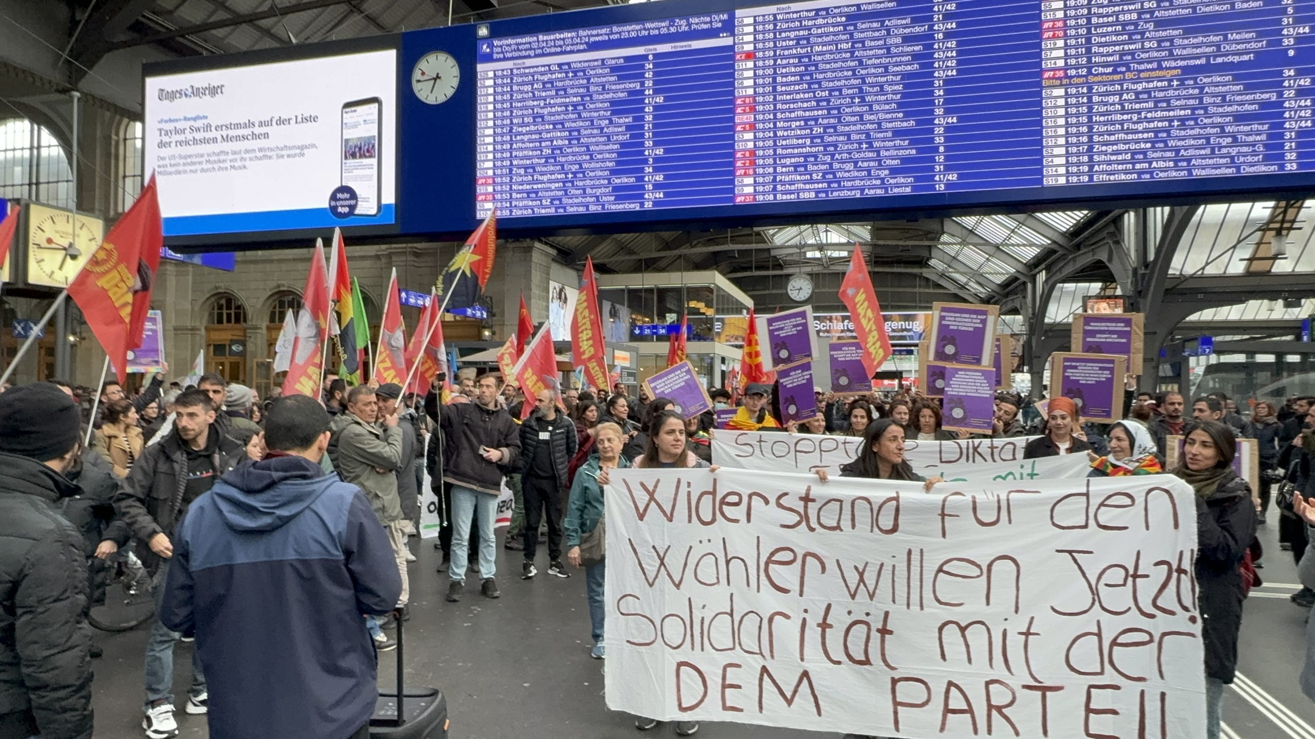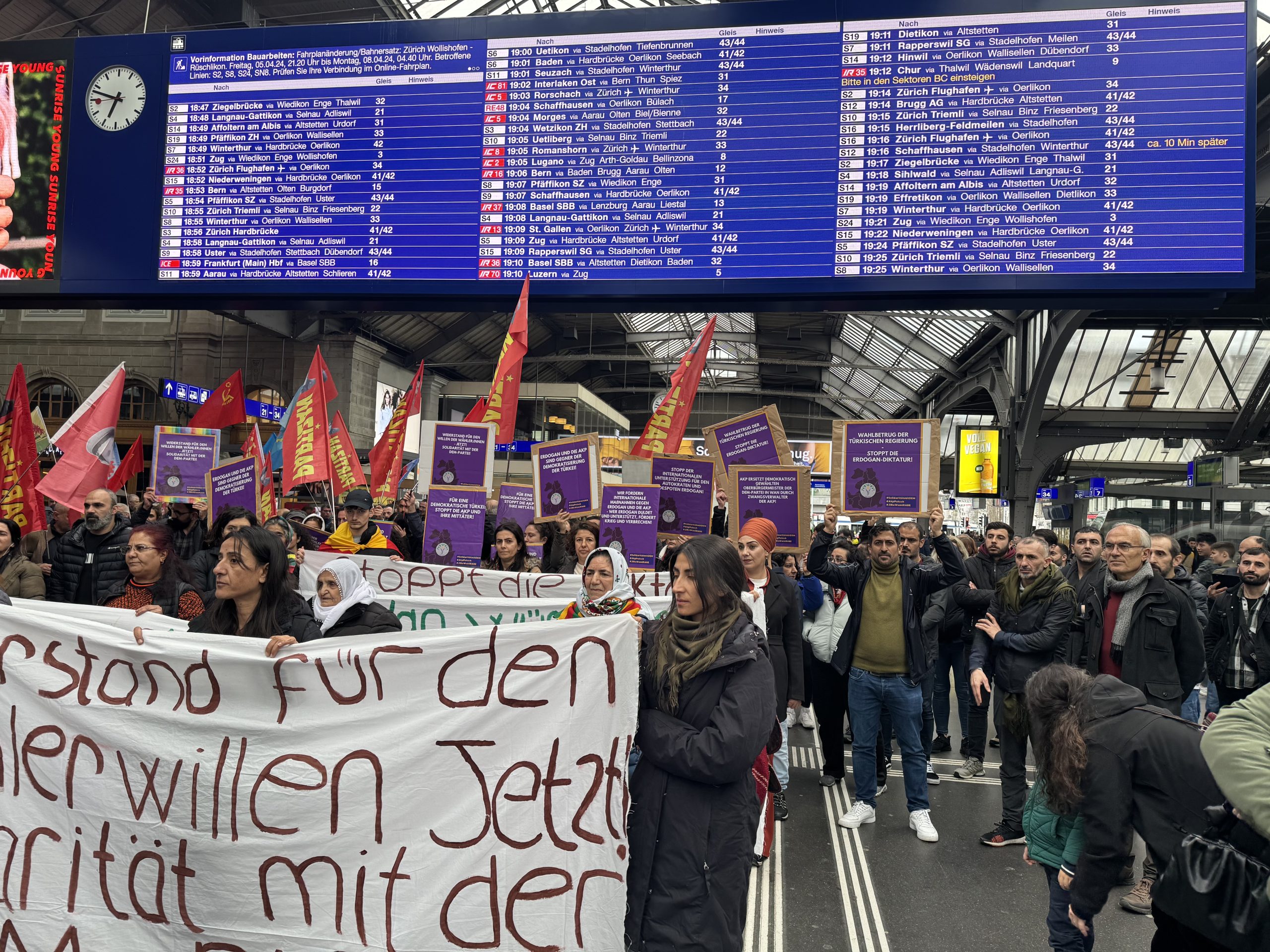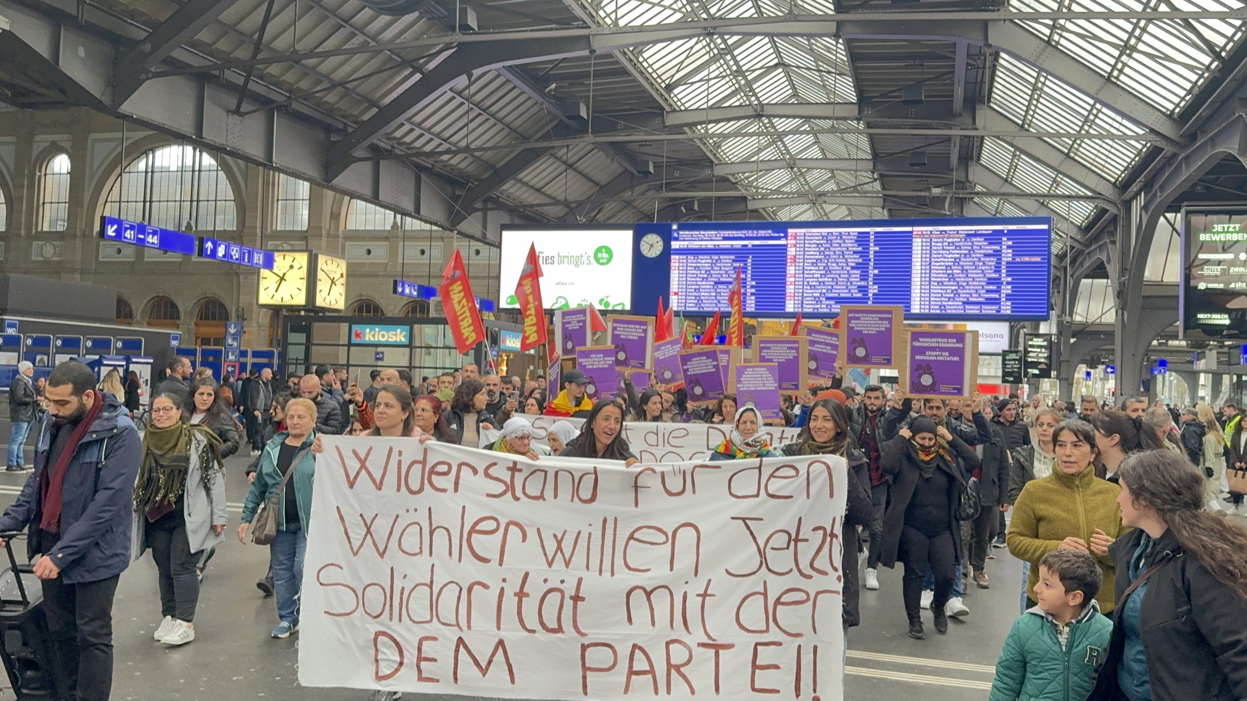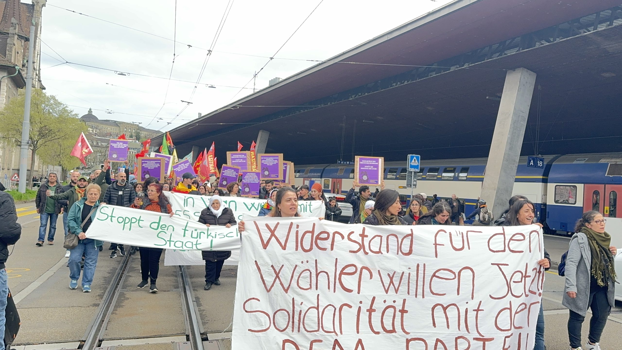 Zürih Tren garında bir araya gelen kitle basın açıklaması okudu.