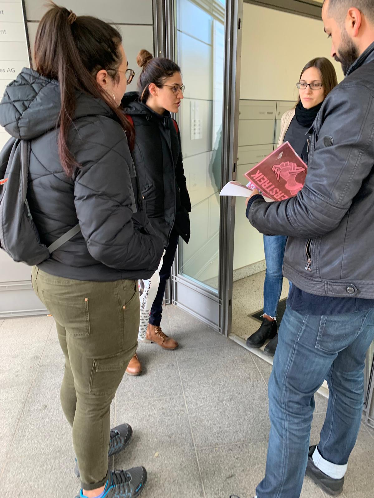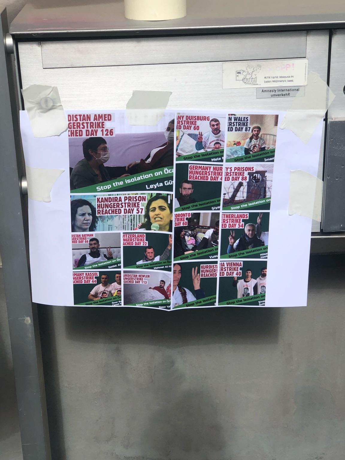 Zürih Gençlik Platformu’ndan gençler, Uluslararası Af Örgütü, İnsan Hakları İzleme Örgütü ve Kızıl Haç kurumlarına giderek kapı ve camlarına açlık grevi eylemcilerinin büyük fotoğraflarını yapıştırdı. Daha sonrasında gençlerle görüşme yapan kurum yetkililerine gençler, hazırladıkları dosyaları verdi.