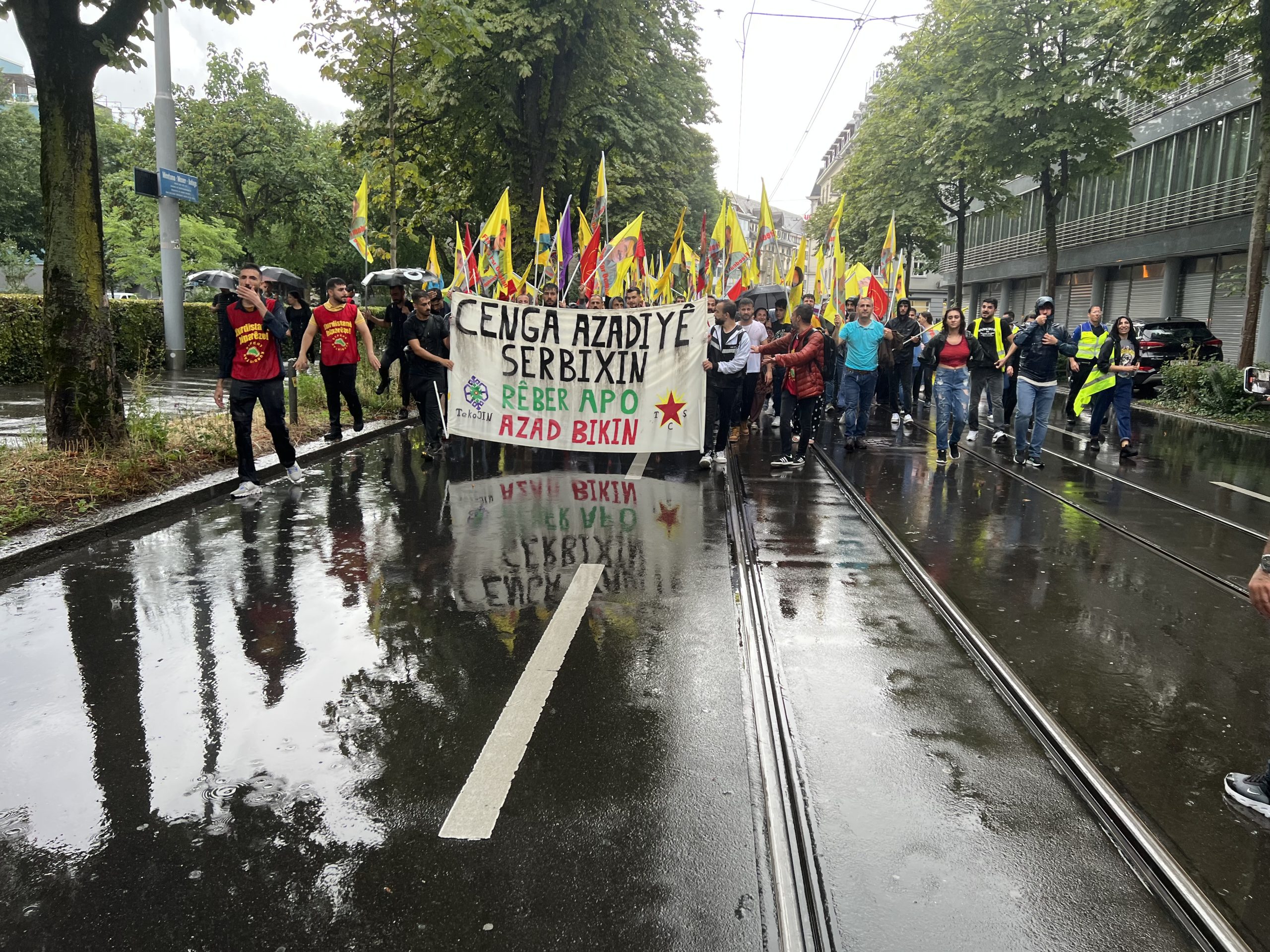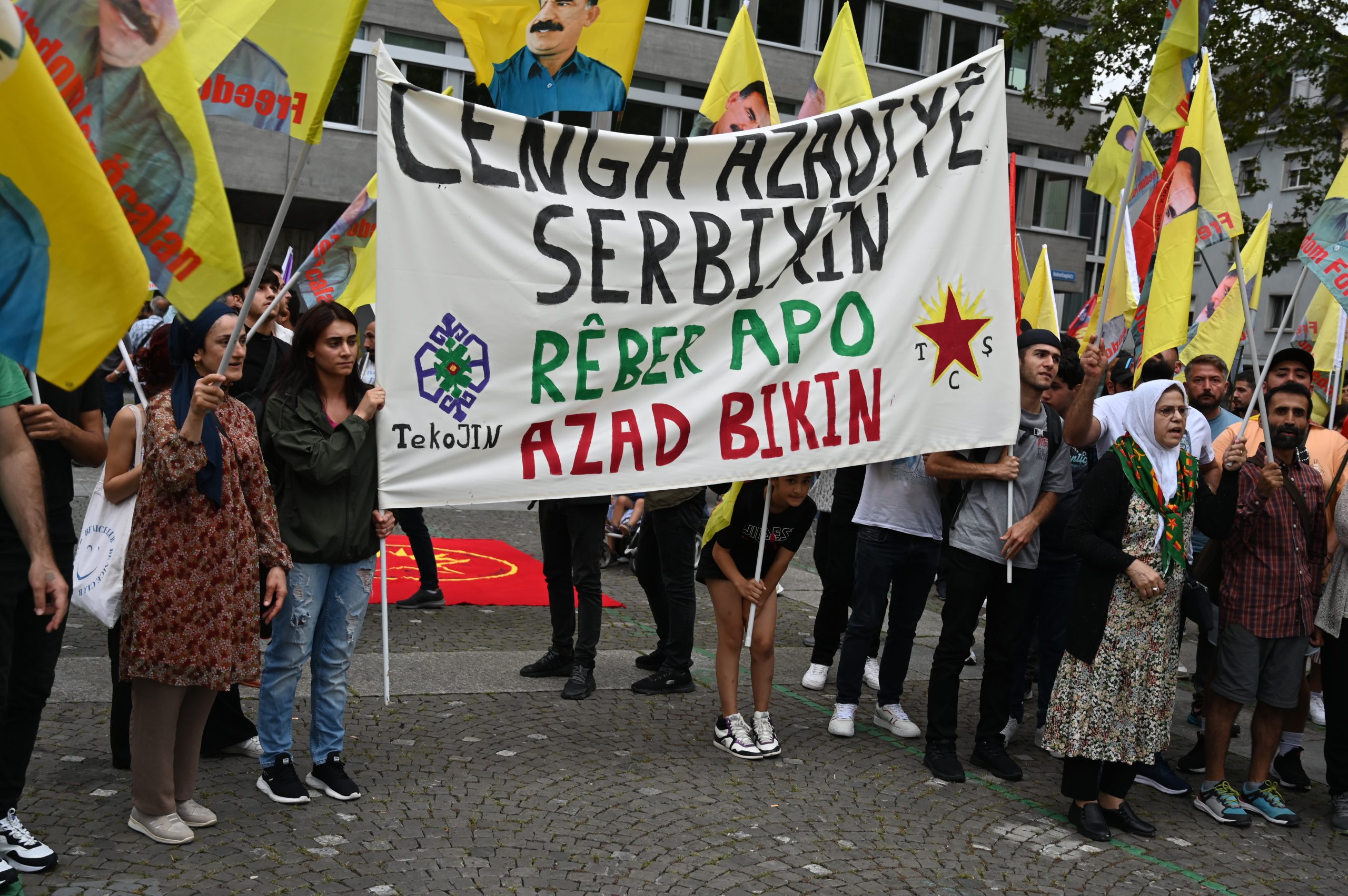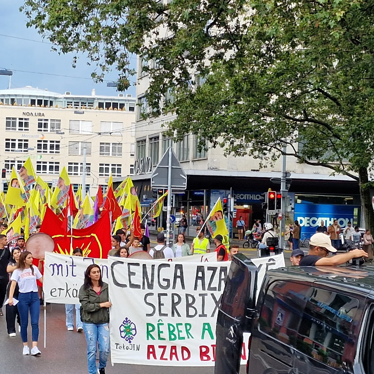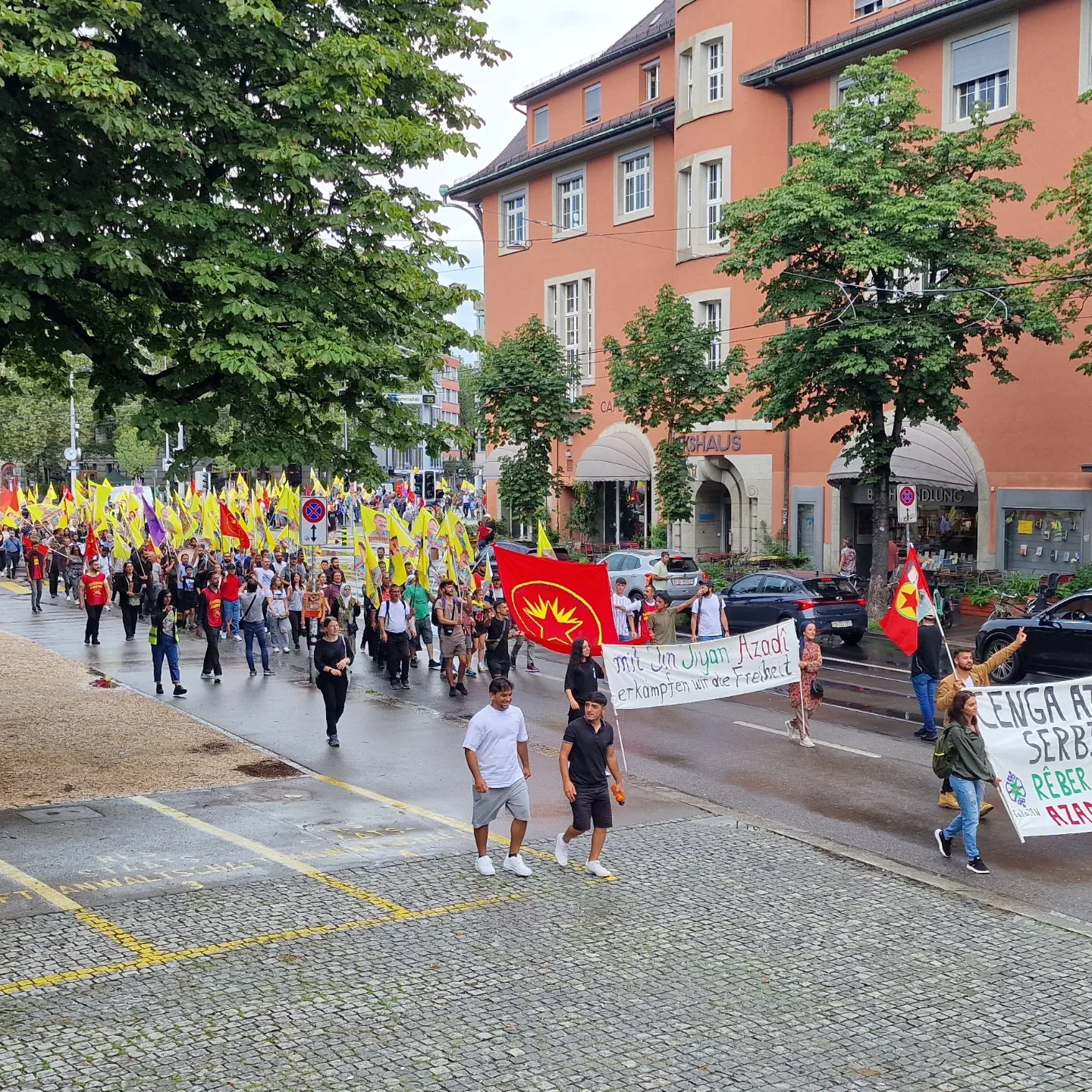 ZÜRİH – “Cenga Azadiyê Serbixin” hamlesi kapsamında Tevgera Ciwanên Şoreşger (TCŞ) ve Jinên Ciwan ên Têkoşer (TekoJIN) öncülüğünde Helvetiaplatz’ta düzenlenen yürüyüş öncesi Kurdistan Özgürlük Mücadelesi şehitleri anısına 1 dakikalık saygı duruşu gerçekleştirildi.