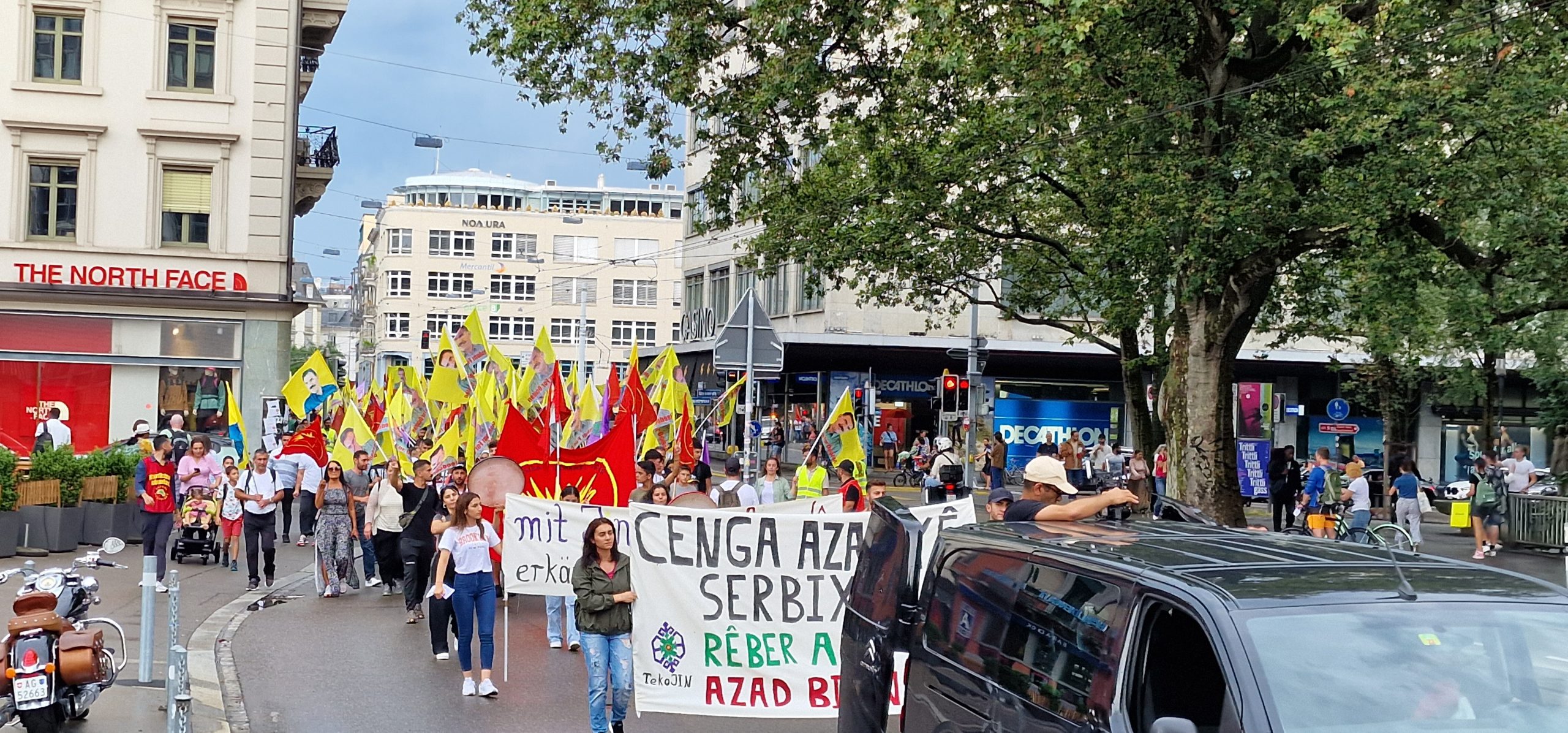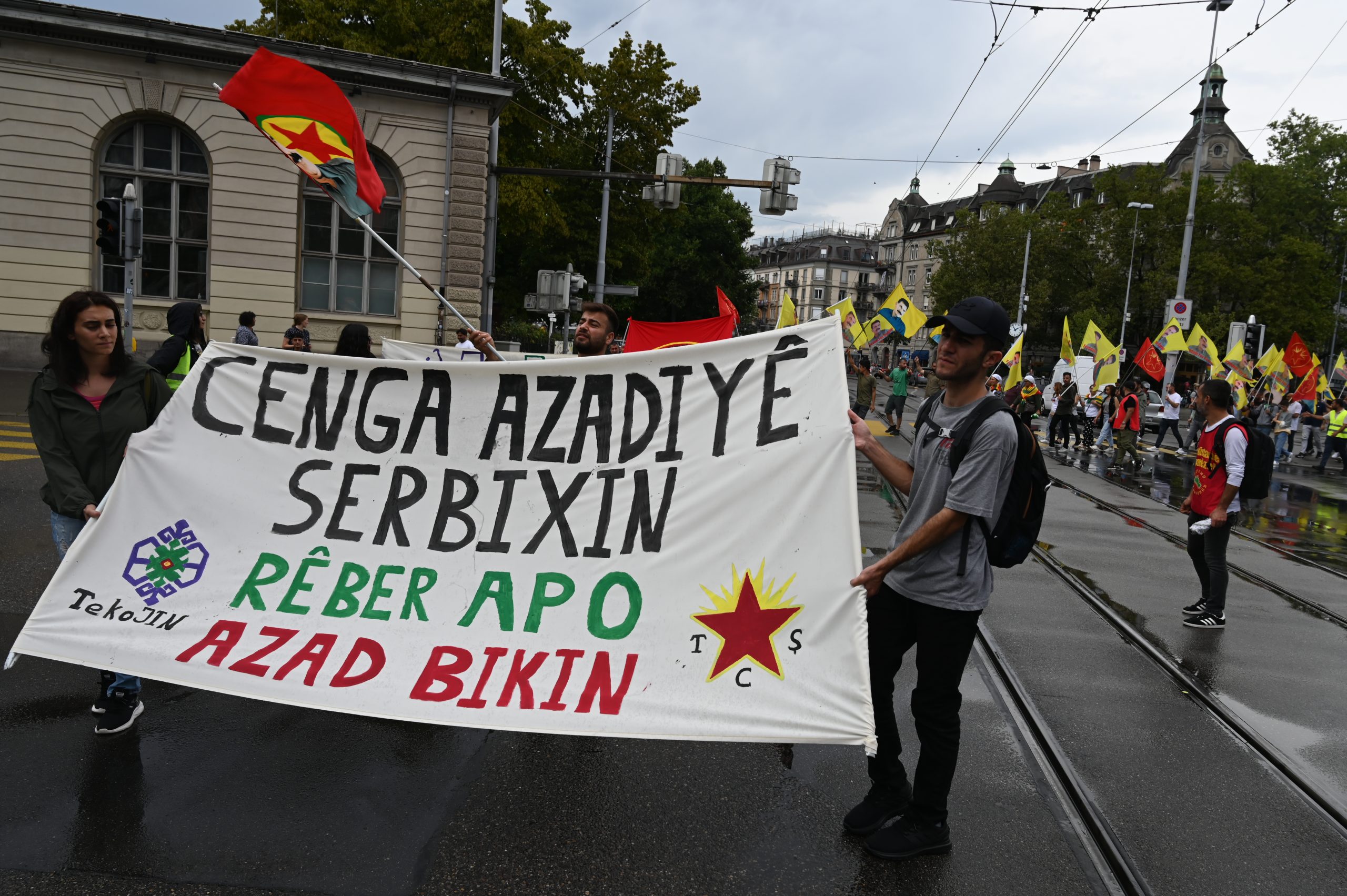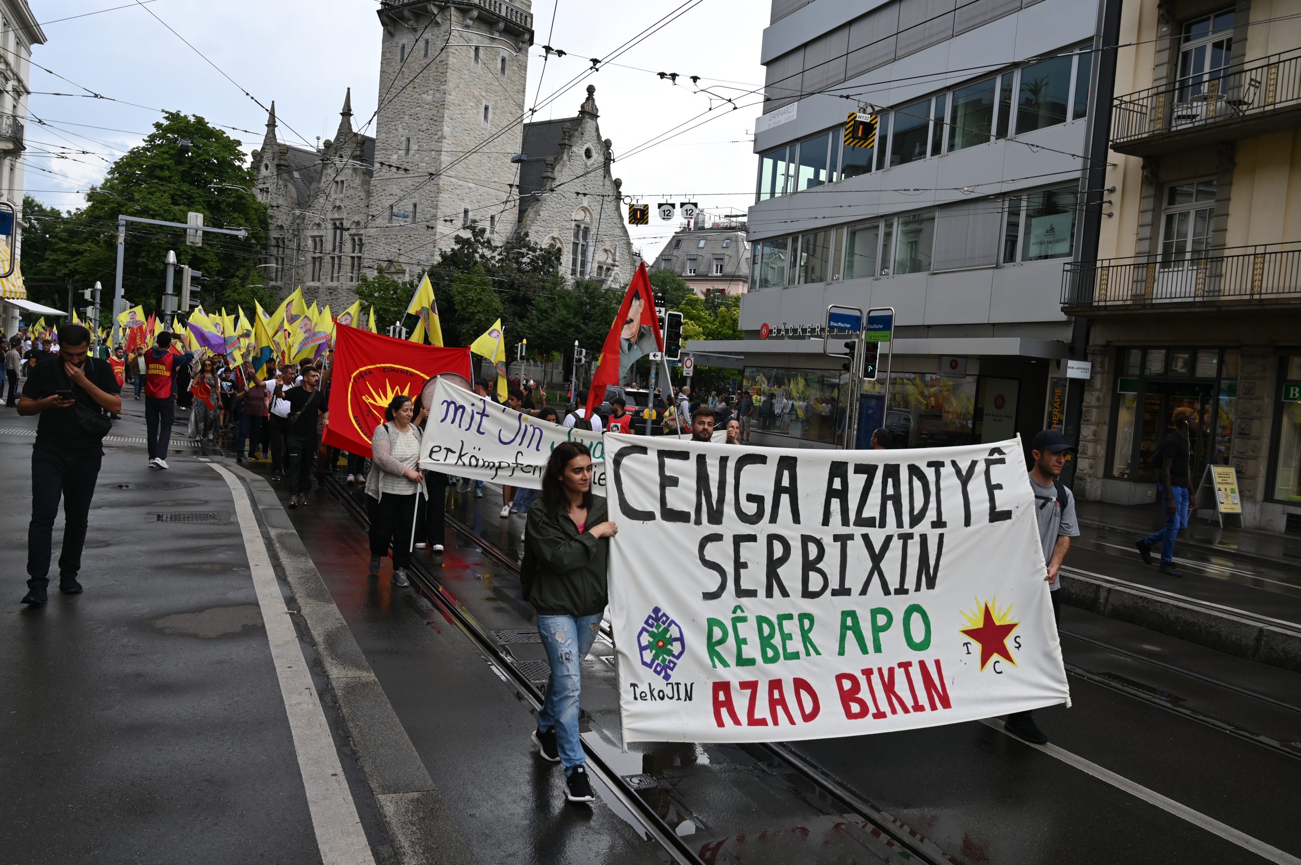 ZÜRİH – “Cenga Azadiyê Serbixin” hamlesi kapsamında Tevgera Ciwanên Şoreşger (TCŞ) ve Jinên Ciwan ên Têkoşer (TekoJIN) öncülüğünde Helvetiaplatz’ta düzenlenen yürüyüş öncesi Kurdistan Özgürlük Mücadelesi şehitleri anısına 1 dakikalık saygı duruşu gerçekleştirildi.